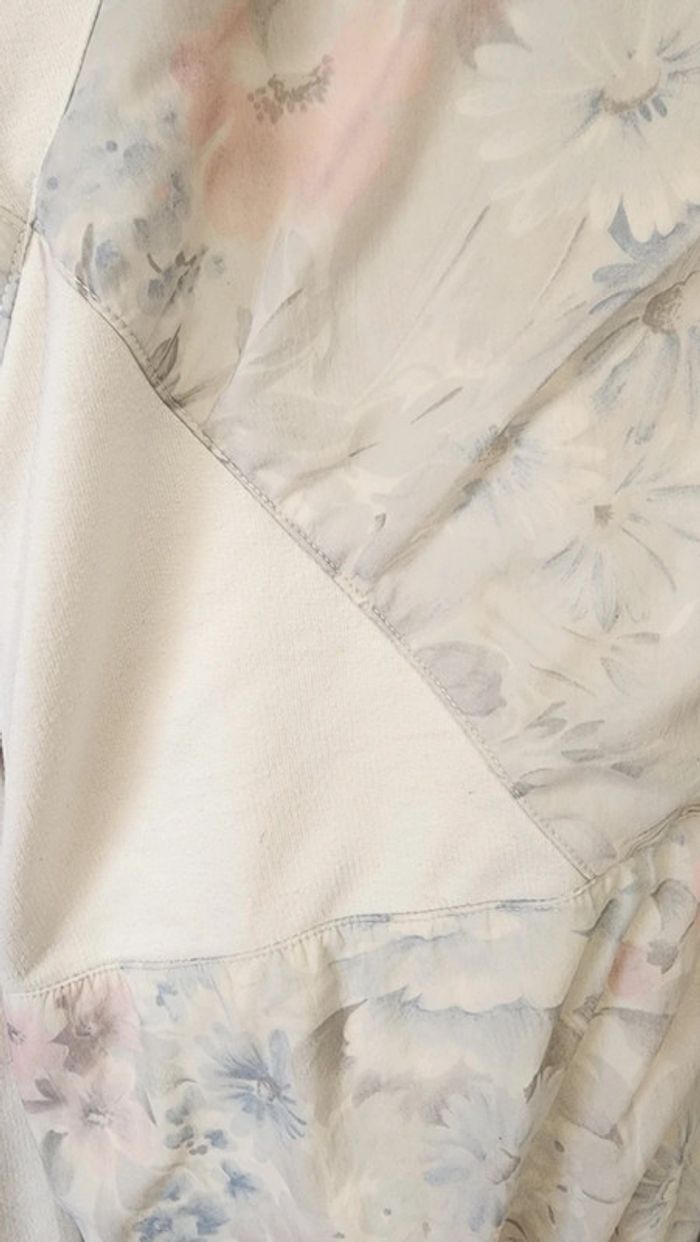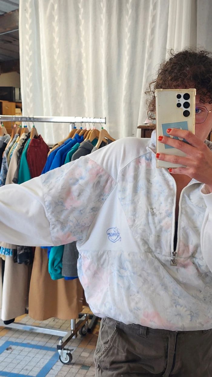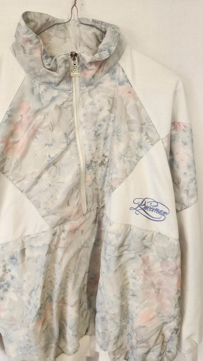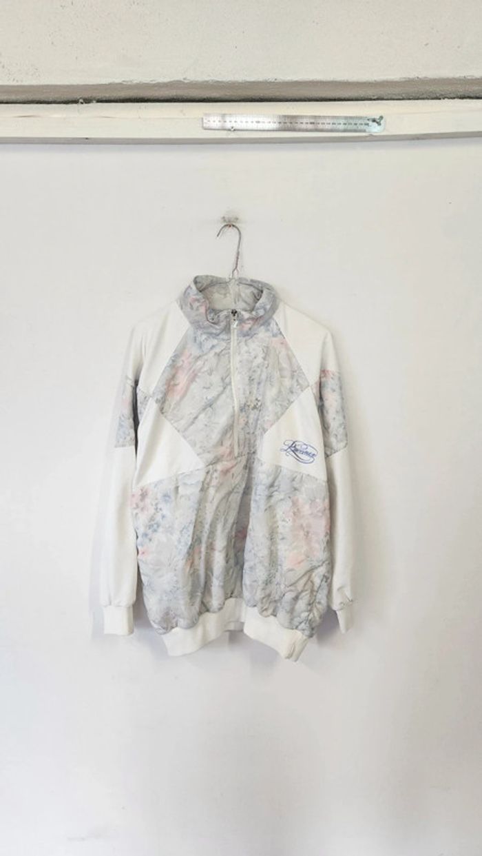 🌼 Remise sur les lots 🌼 -5% pour 2 articles -10% pour 3 articles -15% pour 4 articles -20% pour 5 articles et + www.instagram.com/kozhaevintage 🫶 Sweat vintage eighties, coton blanc et empiecements nylon fleuri pastel Taille 40 à 44