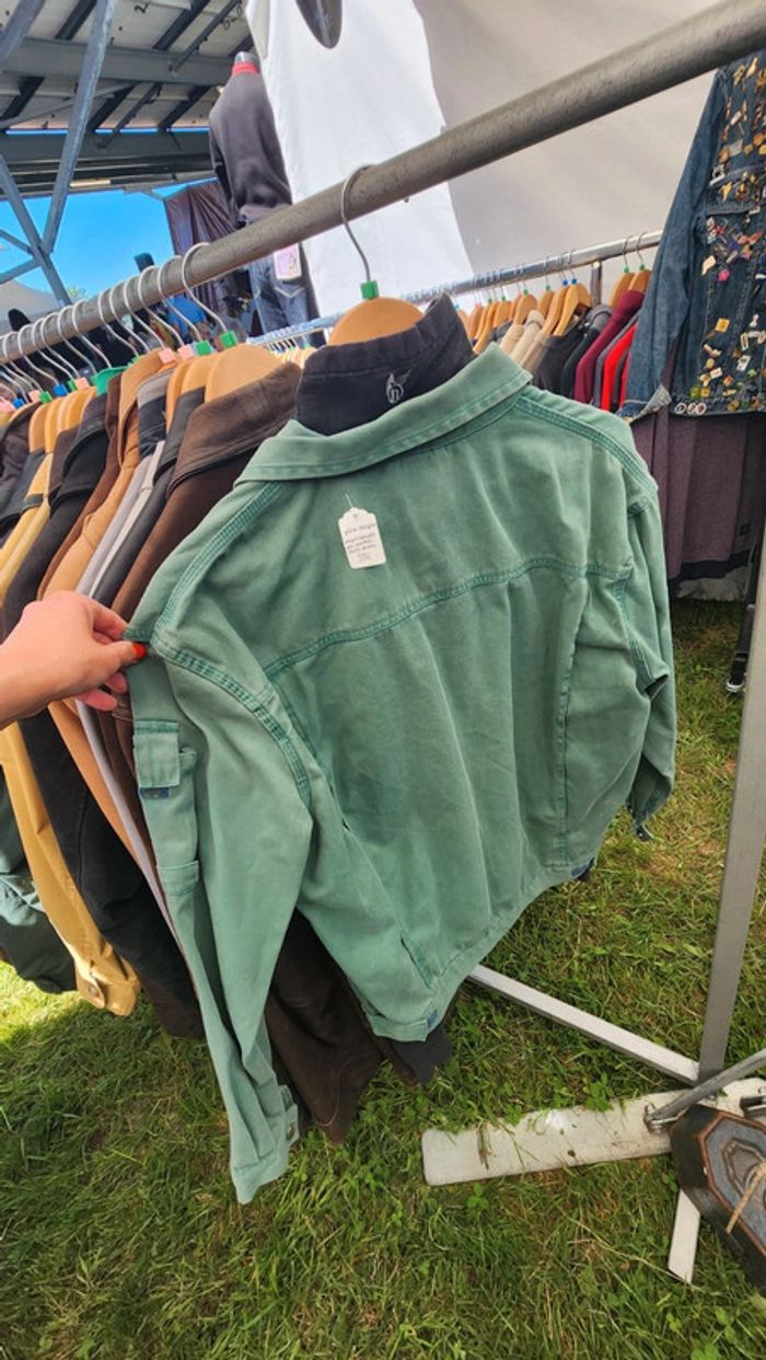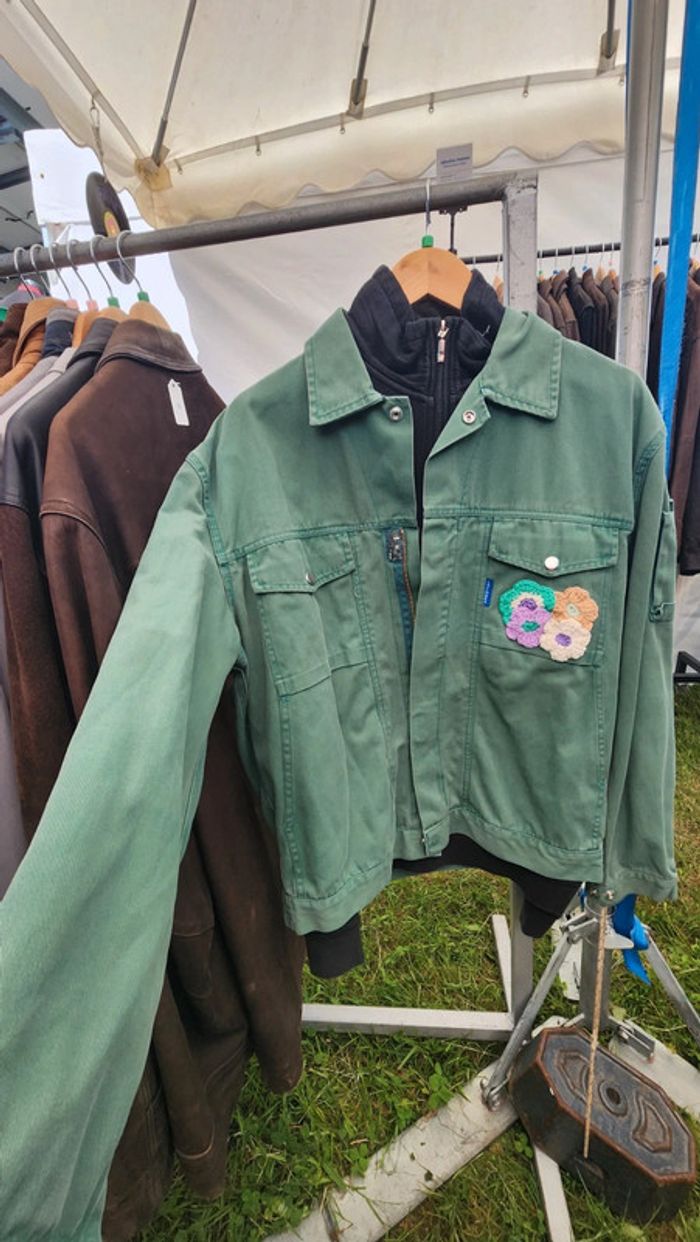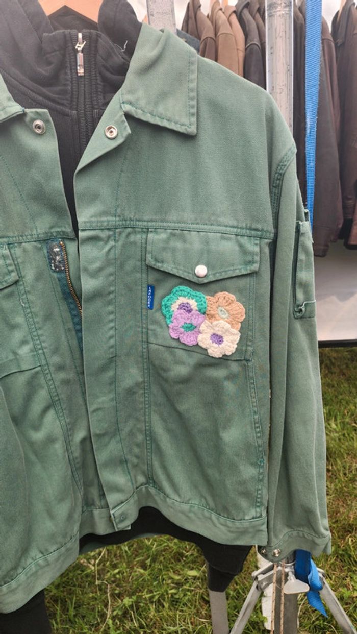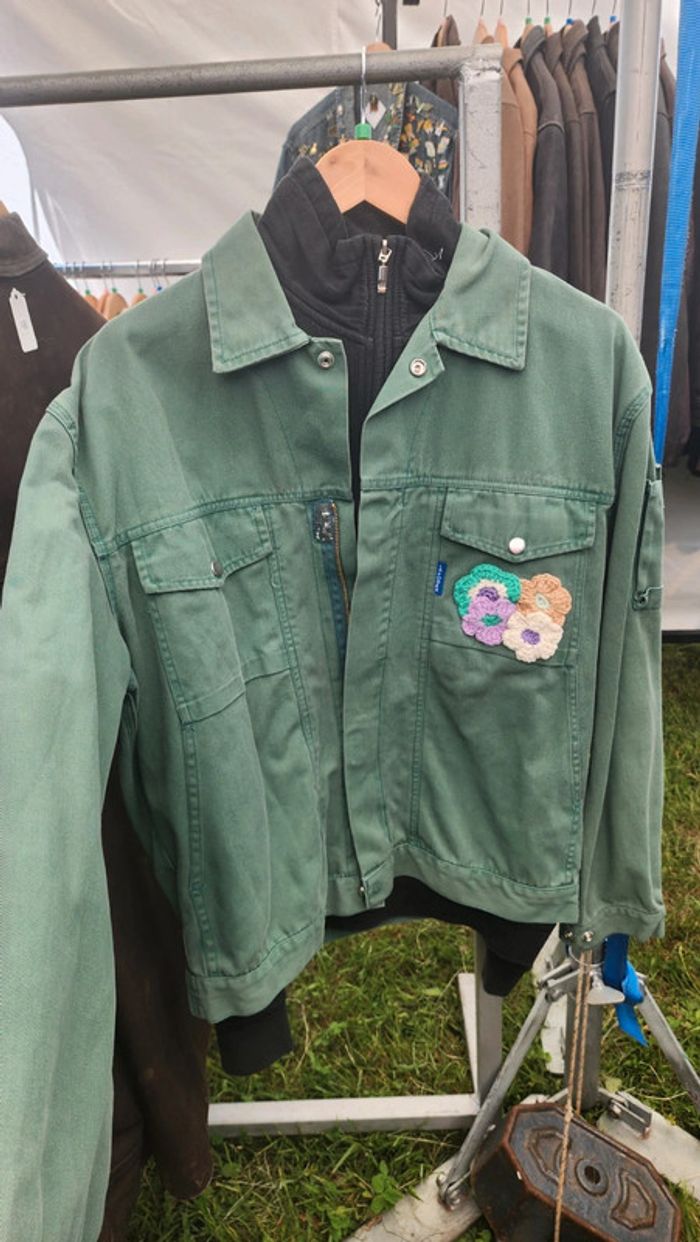 🌼 Remise sur les lots 🌼 -5% pour 2 articles -10% pour 3 articles -15% pour 4 articles -20% pour 5 articles et + www.instagram.com/kozhaevintage 🫶 Jolie veste unisexe taille L homme. Jusque petit 42 femme Coupe blouson ultra cool Fleurs en crochet faites main brodees sur la poche Piece unique Workwear worker