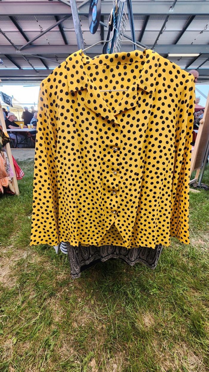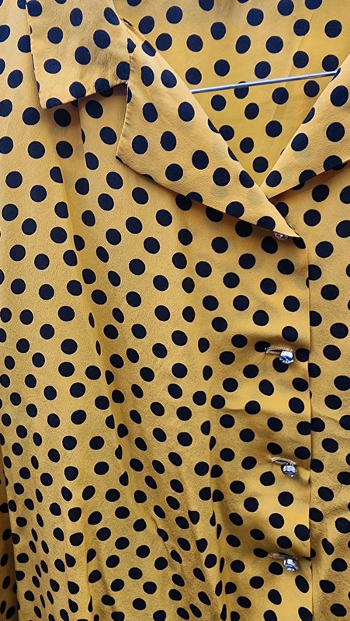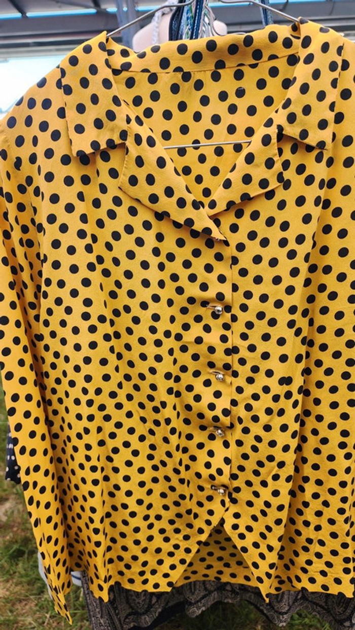 🌼 Remise sur les lots 🌼 -5% pour 2 articles -10% pour 3 articles -15% pour 4 articles -20% pour 5 articles et + www.instagram.com/kozhaevintage 🫶 Adorable chemisier polkadot jaune et noir Tout fin tout leger, viscose melangee texture soie Taille 38 (ok 36 et 34 en oversize)