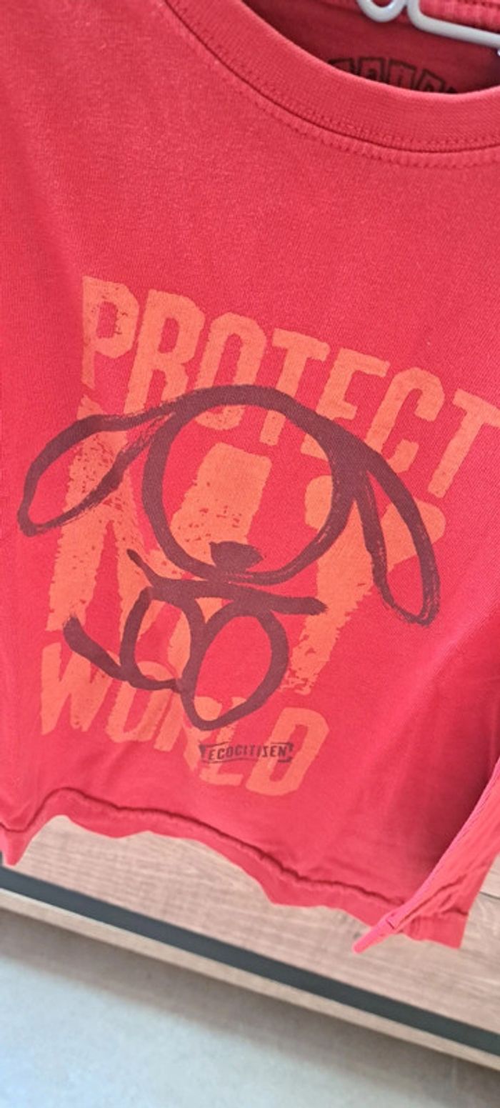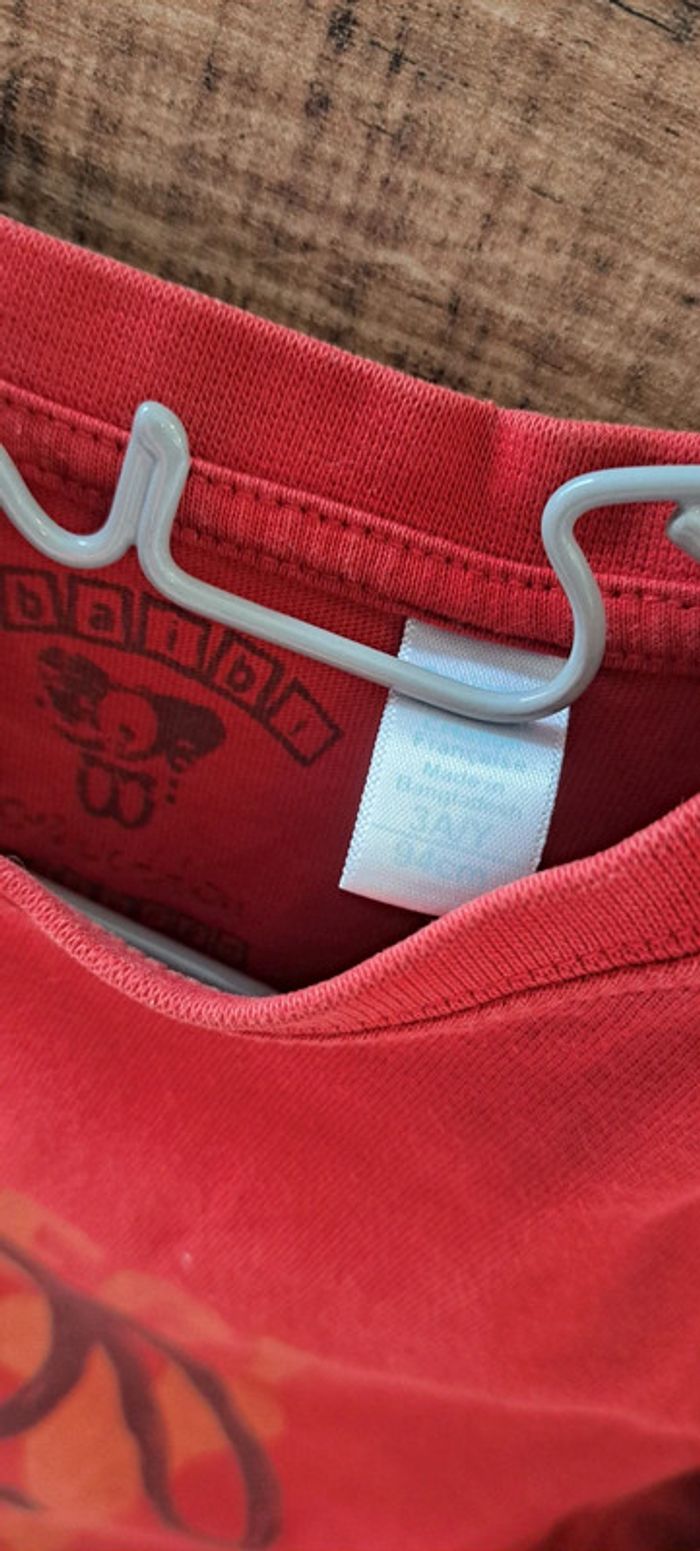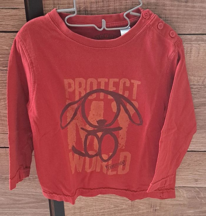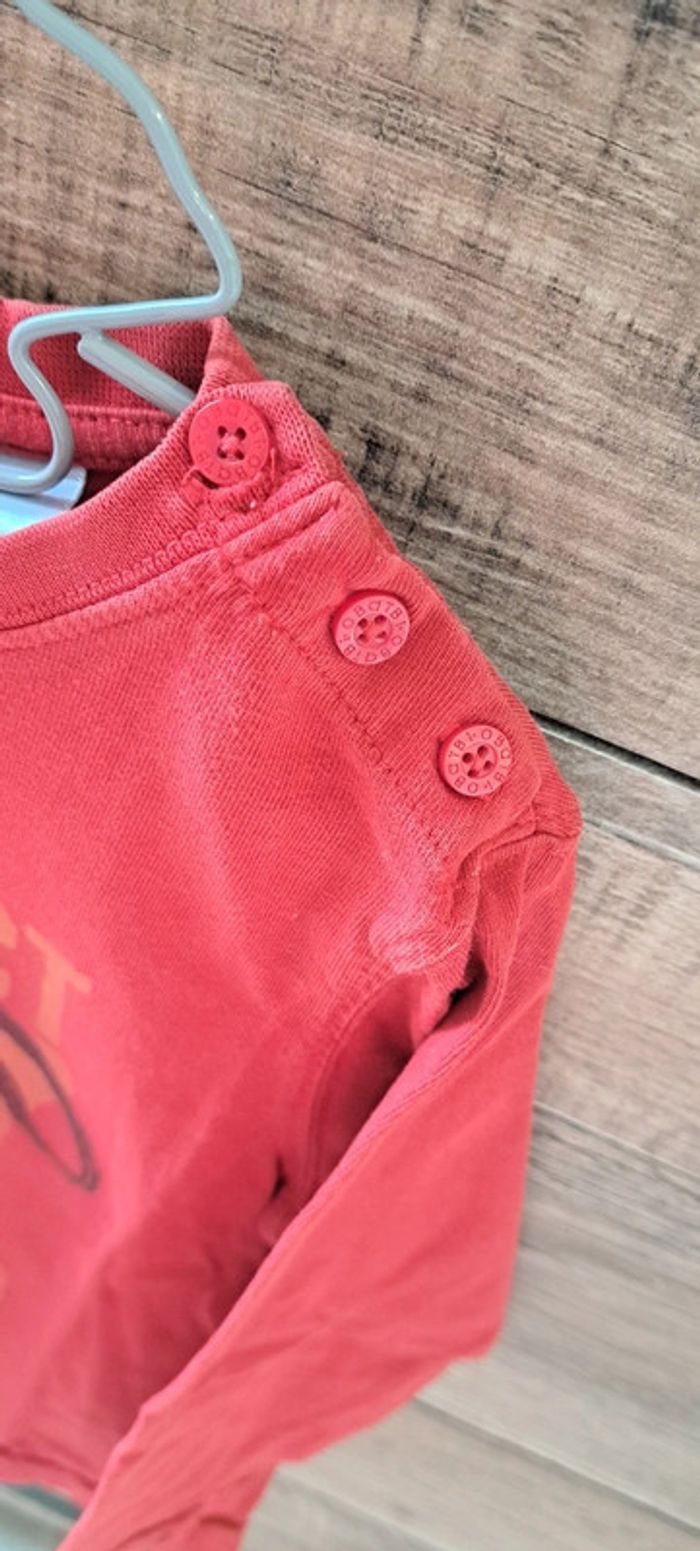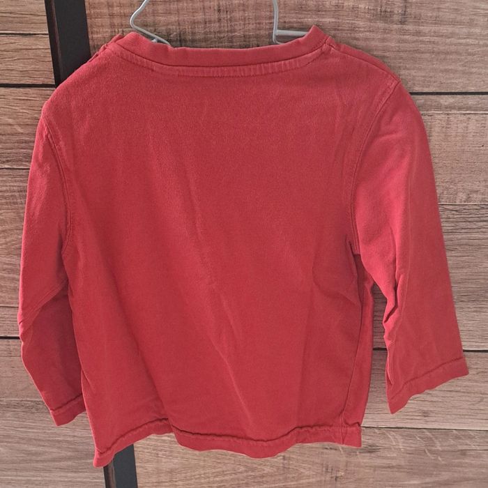 Haut à manches longues rouge avec motifs sur le devant. 3 boutons sur le côté du col. De la marque Obaïbi en taille 3 ans. En très bon état.