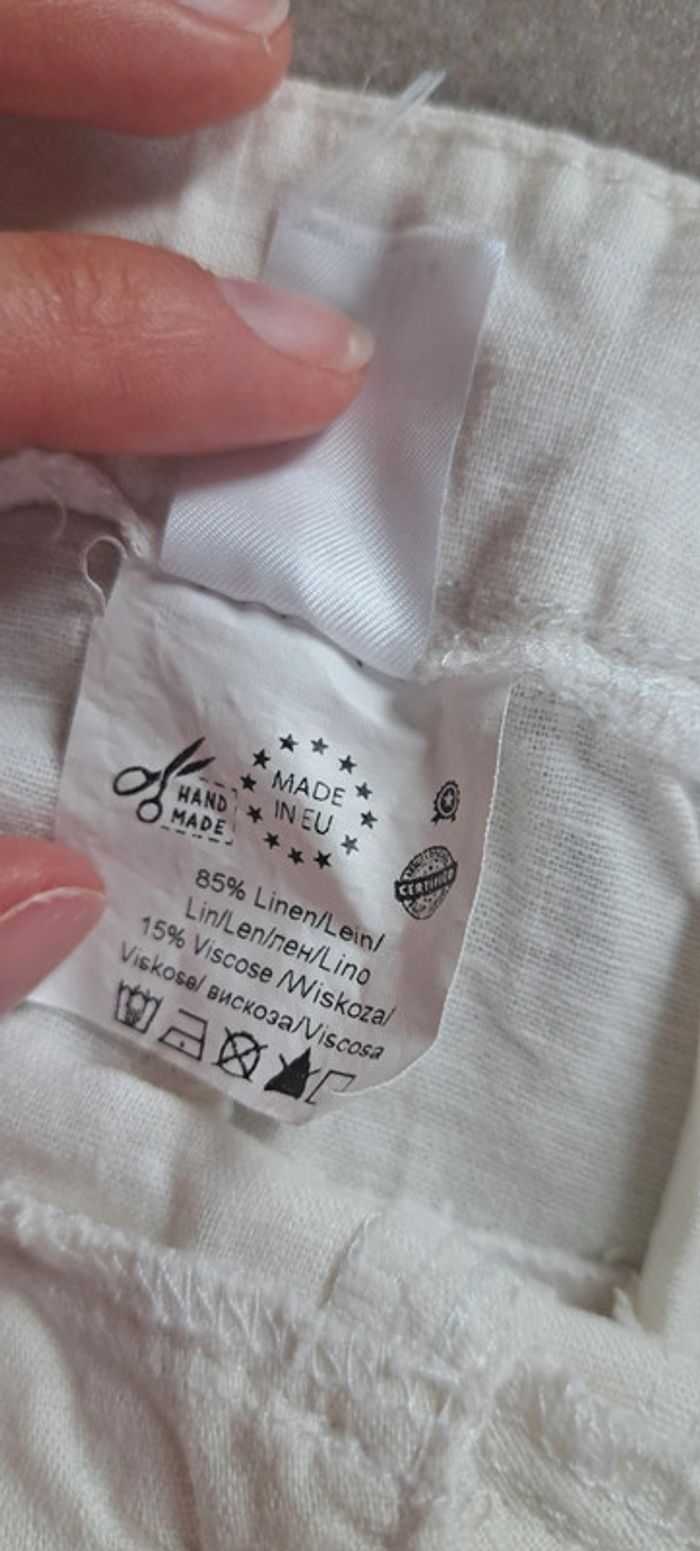 Pantalon beige en lin, très léger pour les beaux jours. En taille 24 mois. Je ne me souviens plus de la marque. En très bon état.