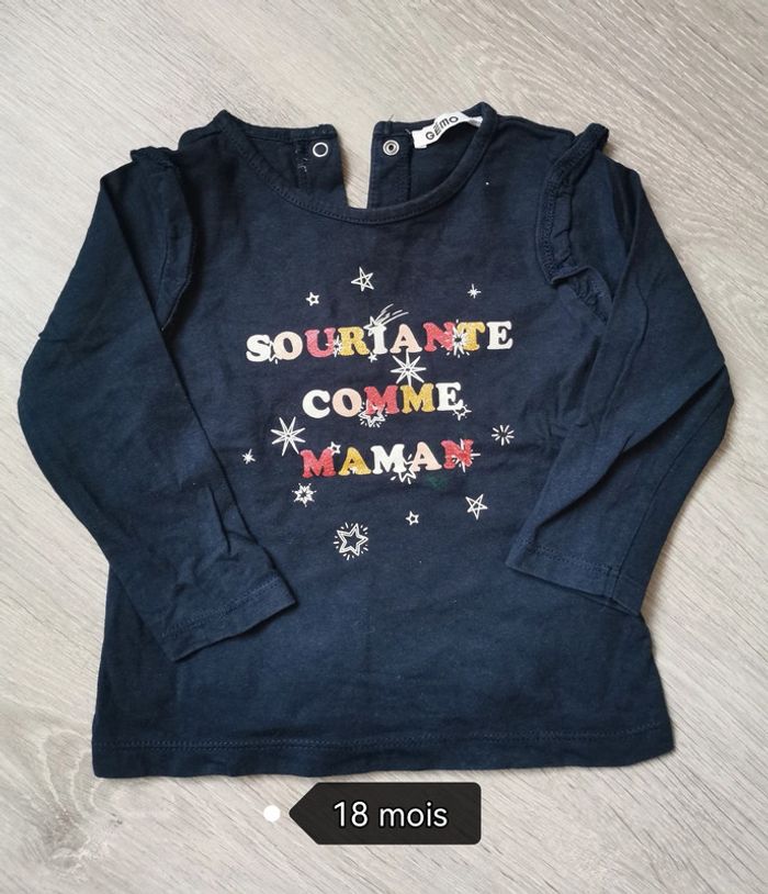T-shirt manche longue fille 18 mois Très bon état Marque : gemo Hésitez pas à regarder mes autres annonce je vous ferai un prix si vous faites un lot.
