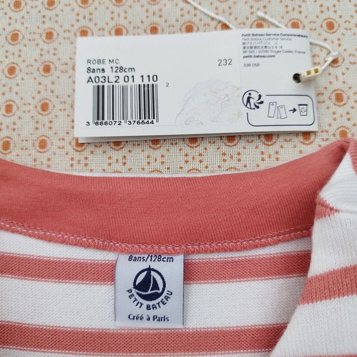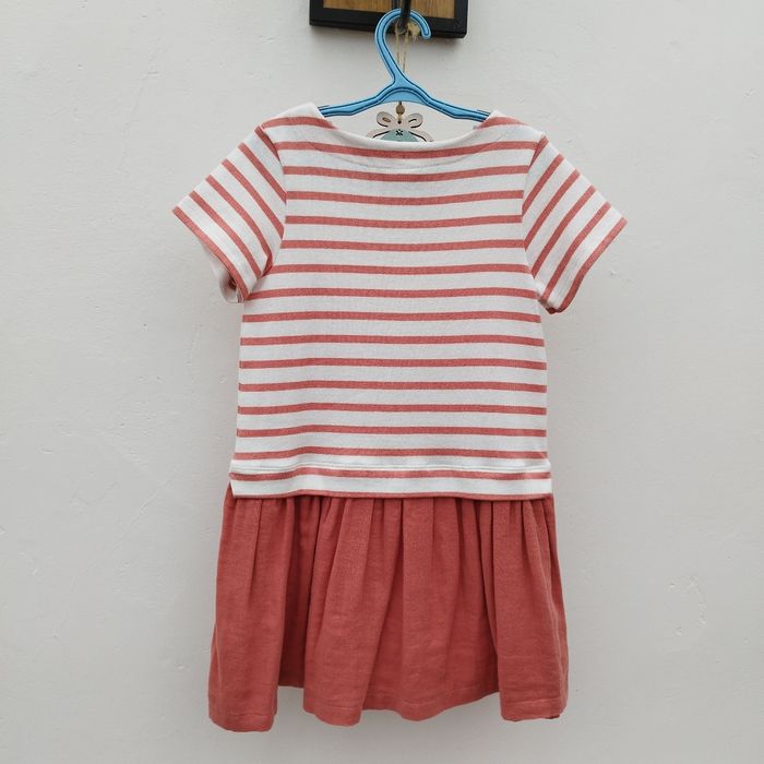 Robe manches courtes. Rayure marinière sur le haut en jersey de coton épais et jupe en gaze de coton pour un effet trompe l'œil. Robe jamais portée ni lavée.