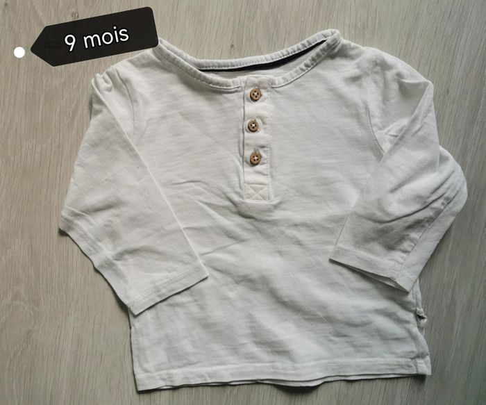 t-shirt manches longues 9 mois garçon Très bon état Marque kiabi Je vend d'autres vêtements de même taille et autre hésitez pas à regarder mes autres annonce je vous ferai un prix si vous faites un lot.