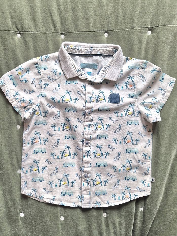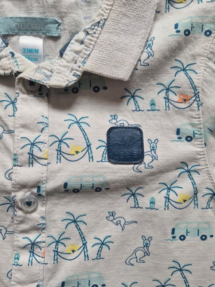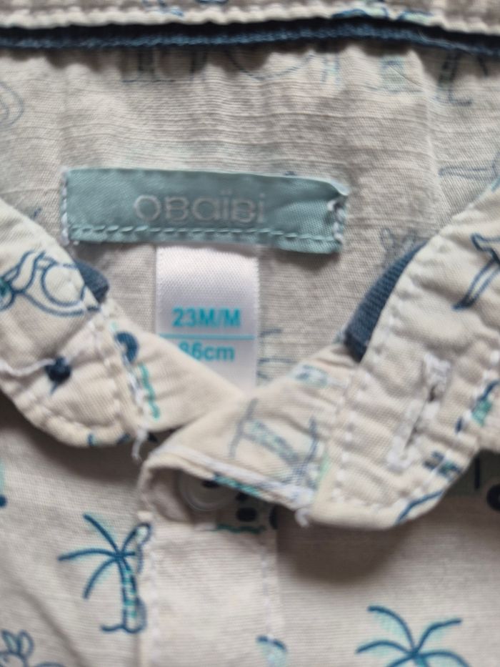 ☀️Adorable chemisette été Obaïbi - Taille 2 ans (86cm) - Parfait état ! ☀️! Description : Taille : 23 mois / 2 ans (86 cm) Marque : Obaïbi État : Parfait état, comme neuve ! Couleur : Fond clair avec un motif estival (palmiers, vans, kangourous) dans les tons bleus et une pointe de jaune. Manches courtes, idéale pour les beaux jours. Col chemise classique et ouverture boutonnée sur le devant. Tissu léger et agréable à porter. Prix : 3 euros N'hésitez pas si vous avez des questions ! 😊