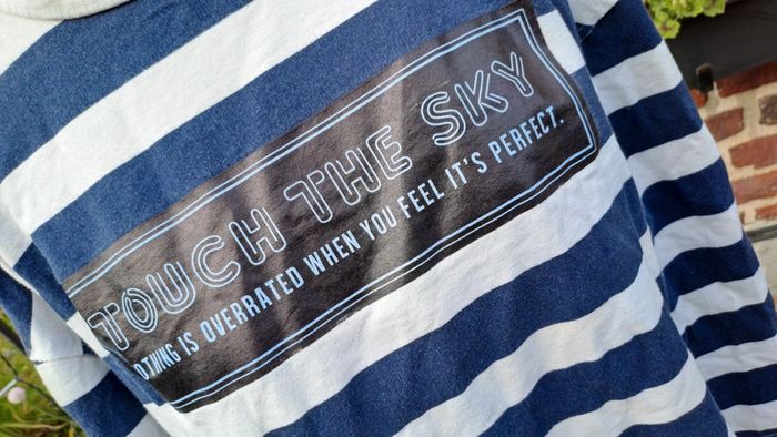 Sweat plutôt court et large. Motif floqué sur le devant. Rayé blanc et marine. En très bon état. #femme_haut_T36_alixetseb