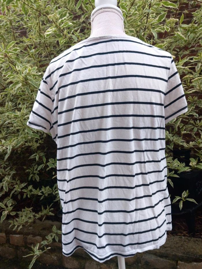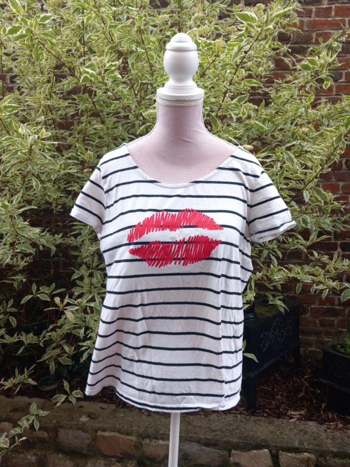 Blanc, rayé noir, la bouche est floquée par dessus. Il a été porté mais reste en bon état. #femme_haut_T42_alixetseb