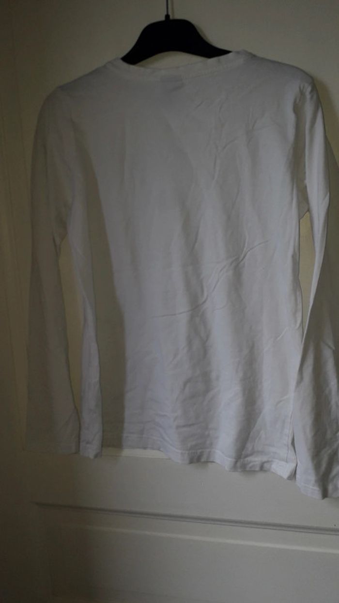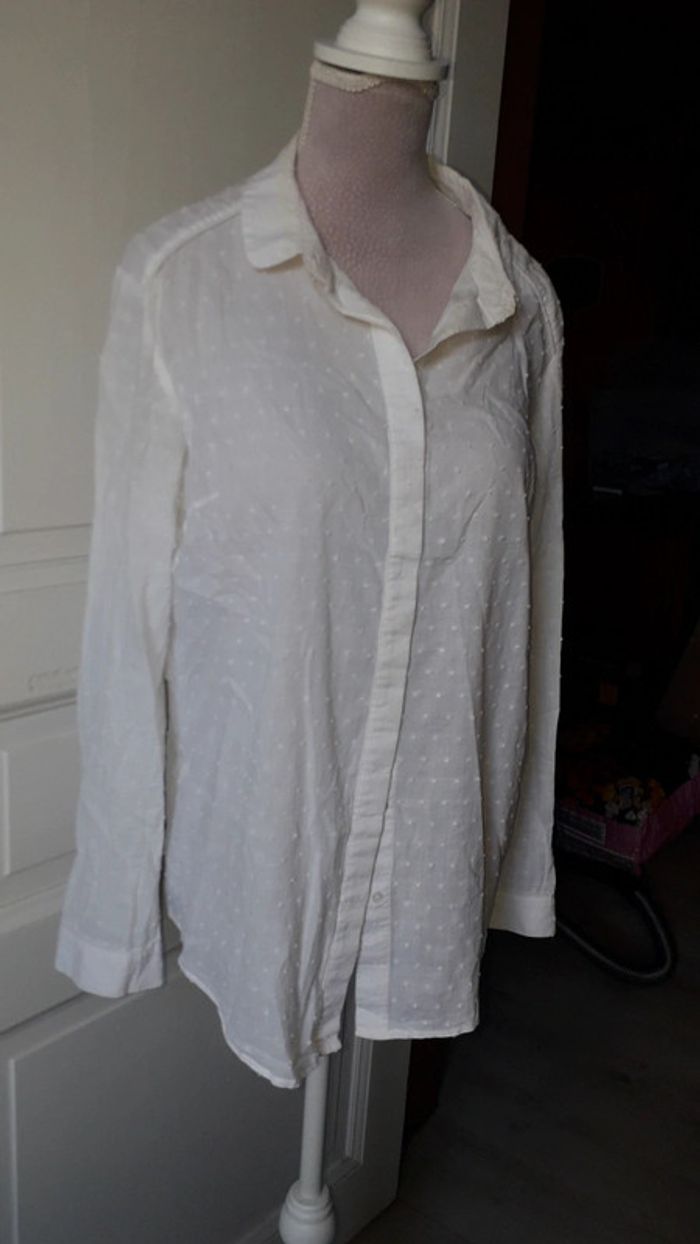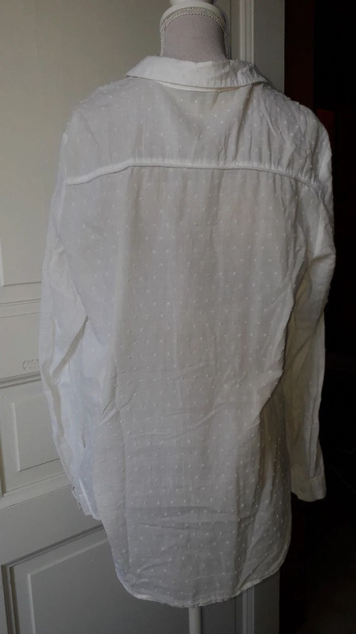 Coupe droite, petits pois en relief. Pas tout à fait blanc. En très bon état, mais l'étiquette intérieure est coupée. #femme_haut_T38_alixetseb