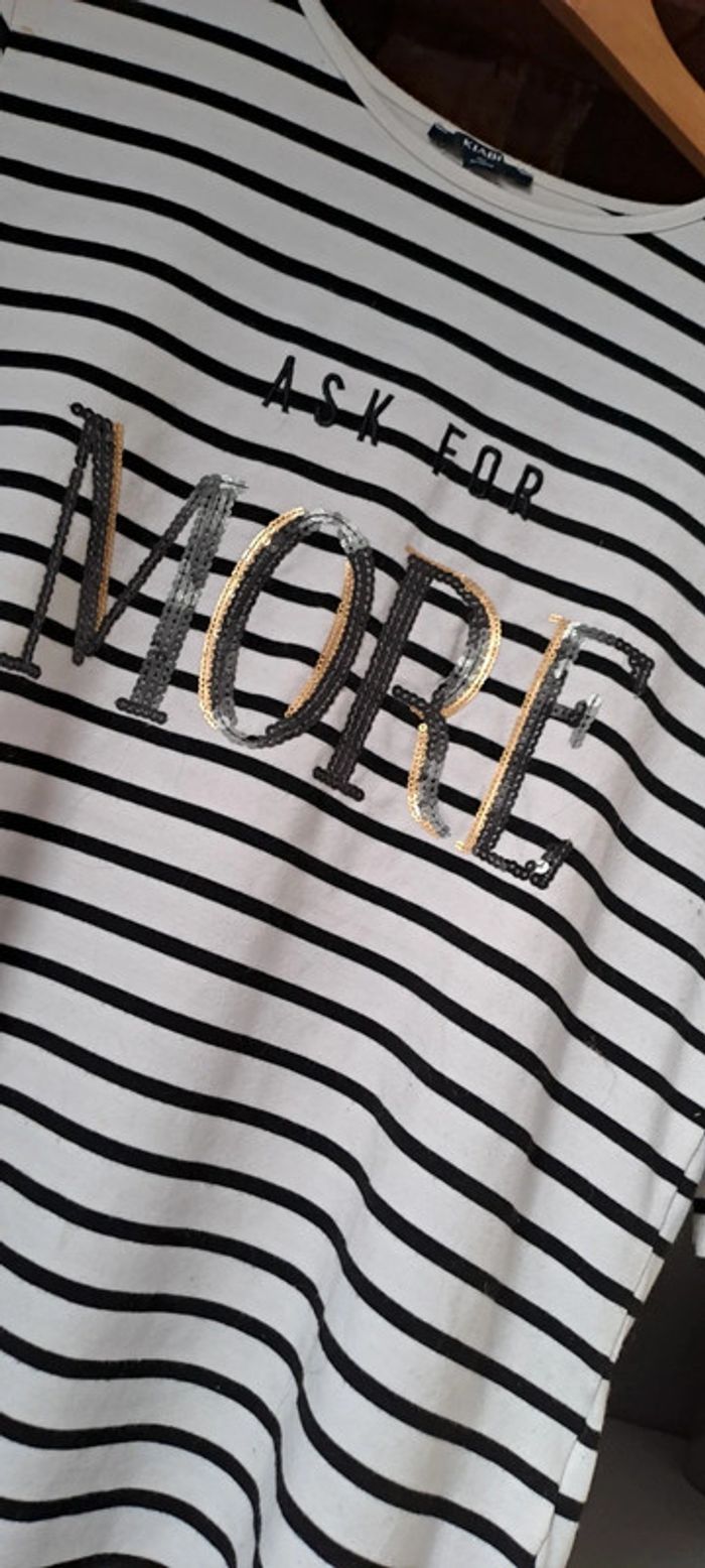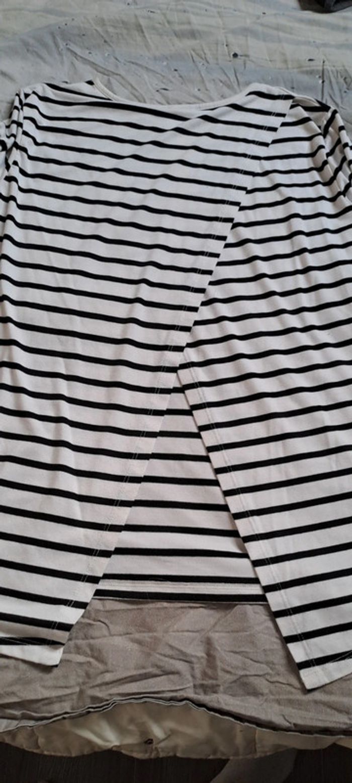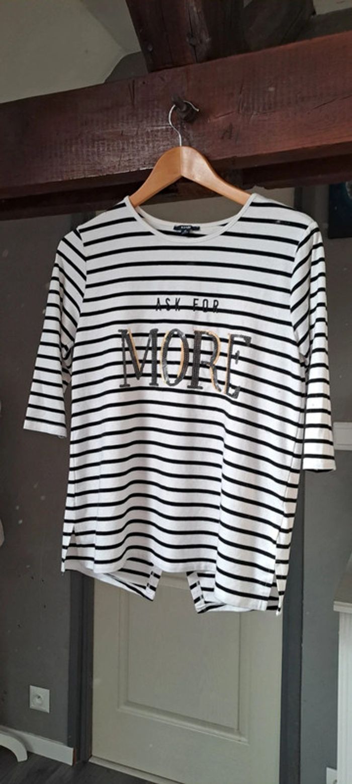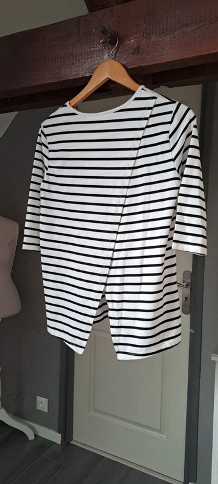 T-shirt original car il est ouvert dans le dos. Rayé noir et blanc, le motif sur le devant est brodé et à sequins. Manches 3/4. En très bon état. #femme_haut_T38_alixetseb