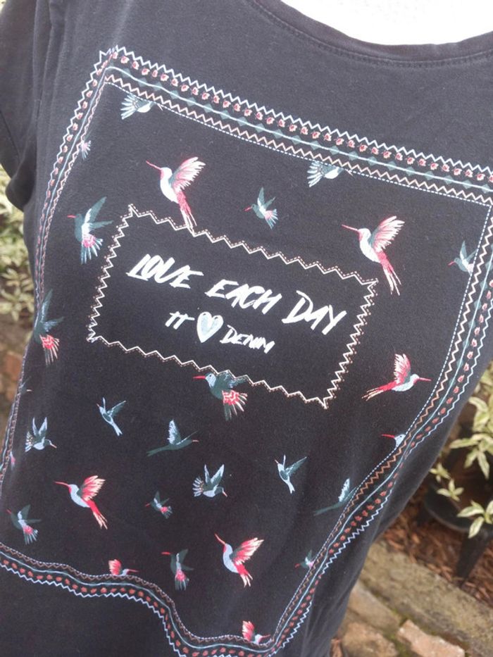 Basic noir, très joli imprimé sur le devant. Porté mais reste en très bon état. #femme_haut_T38_alixetseb