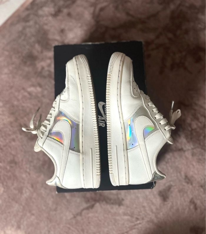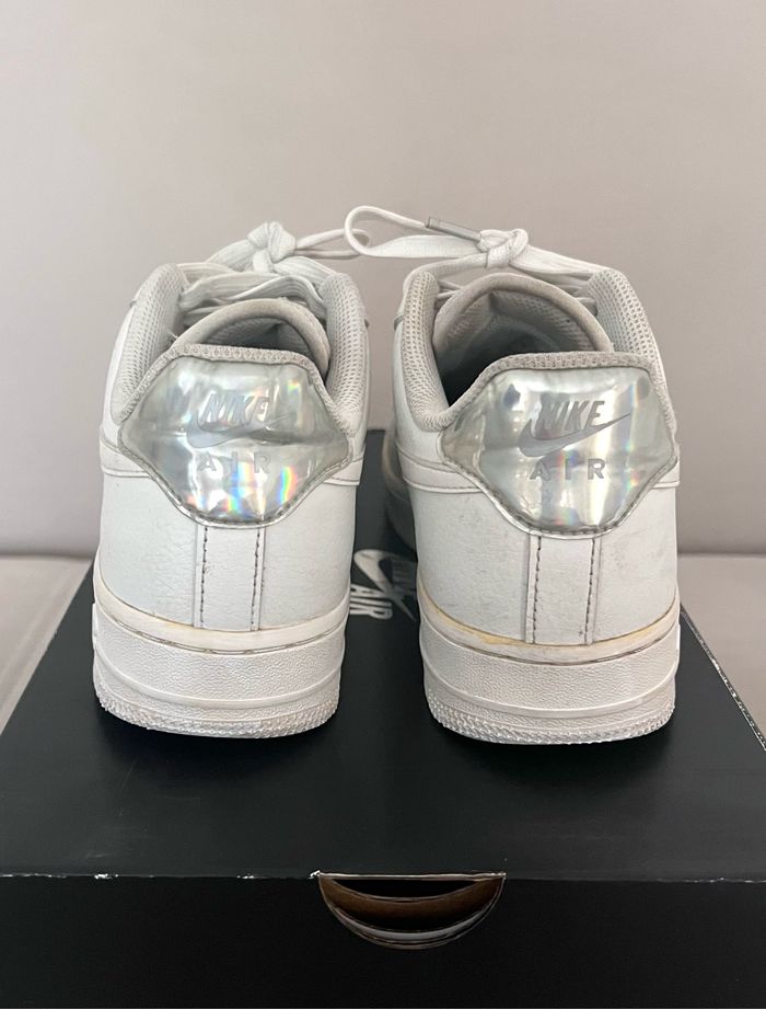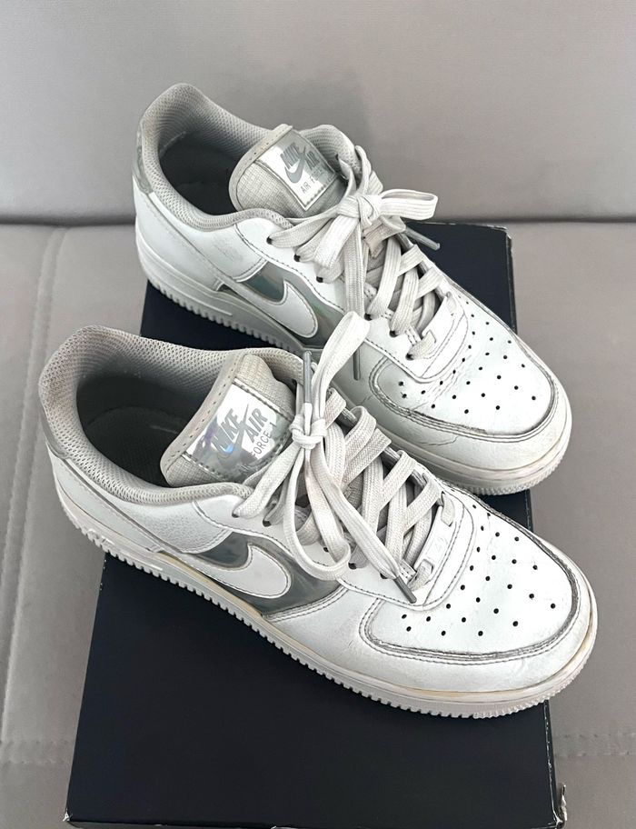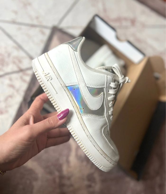 Baskets Nike Air Force 1 Pointure 38 Coloris blanc et argent métallique Partie argentée holographique Matière en cuir Paire vendue dans sa boîte d'origine Quelques traces Je vends d'autres baskets 📩Je réponds rapidement aux messages 📦Envoi rapide et soigné