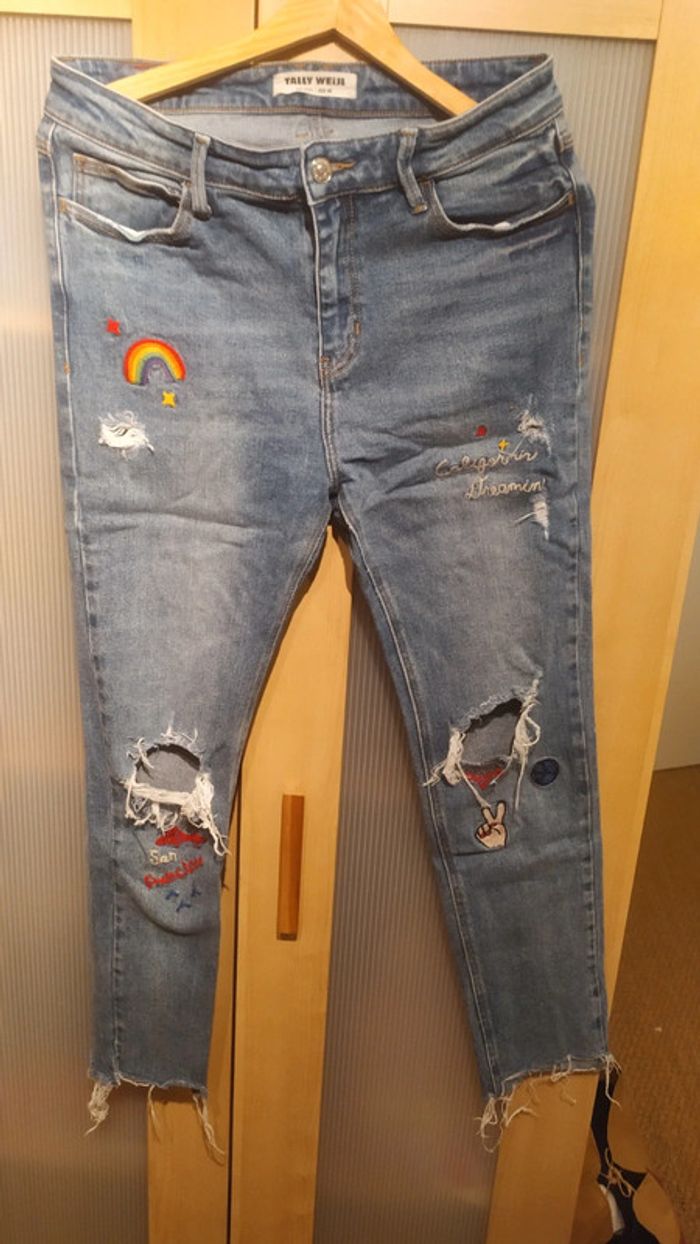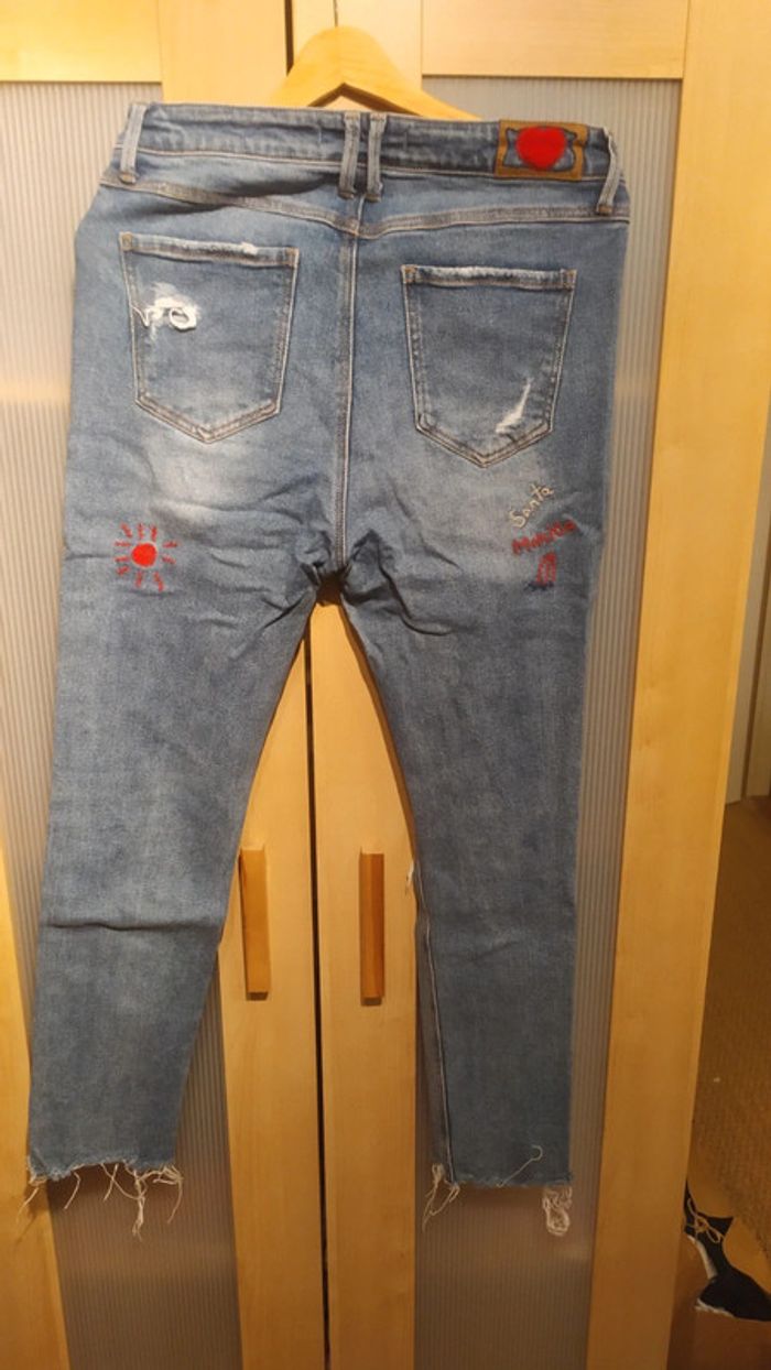 Jean slim troué + patchs et broderies Bleu clair Effiloché en bas Taille 40