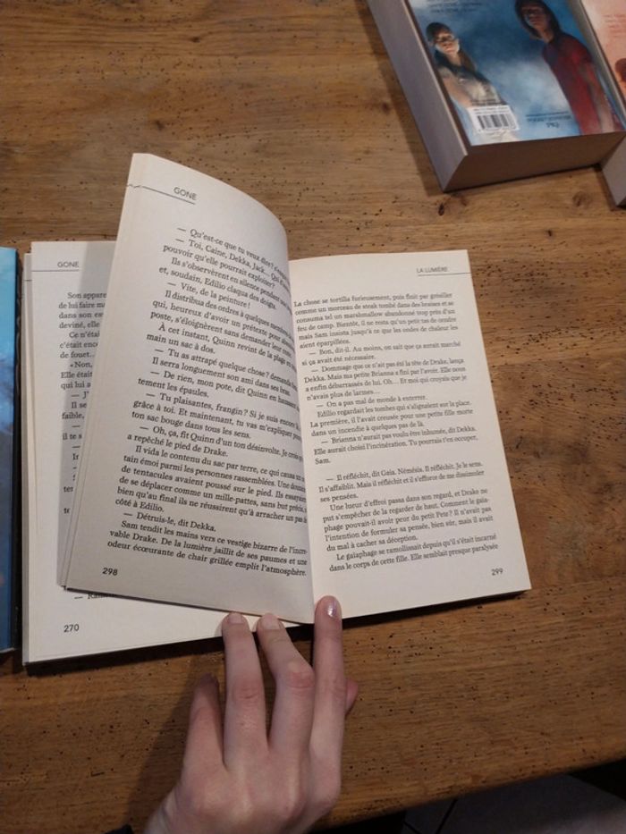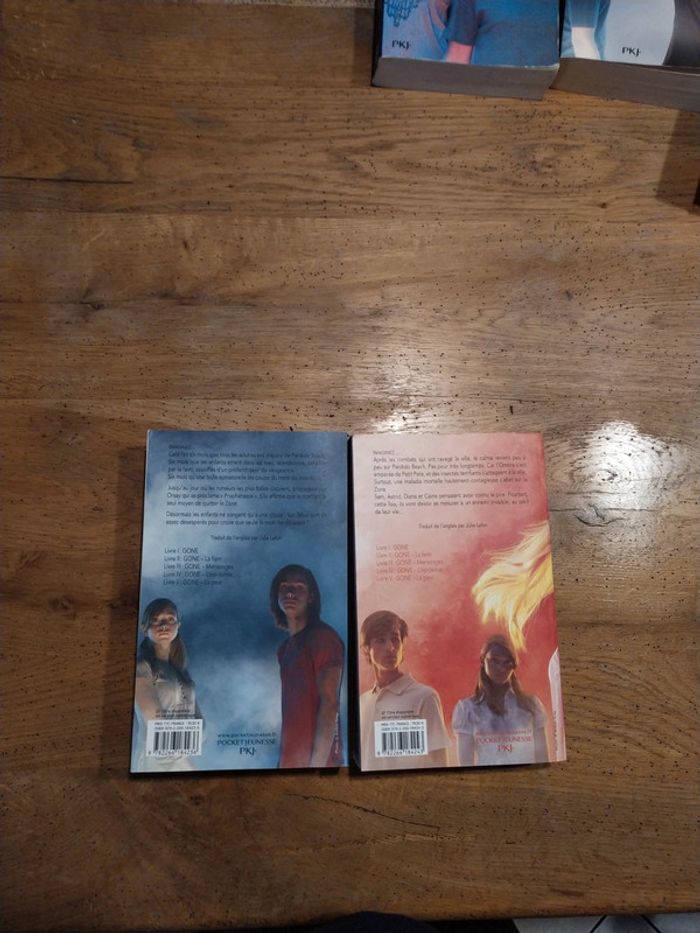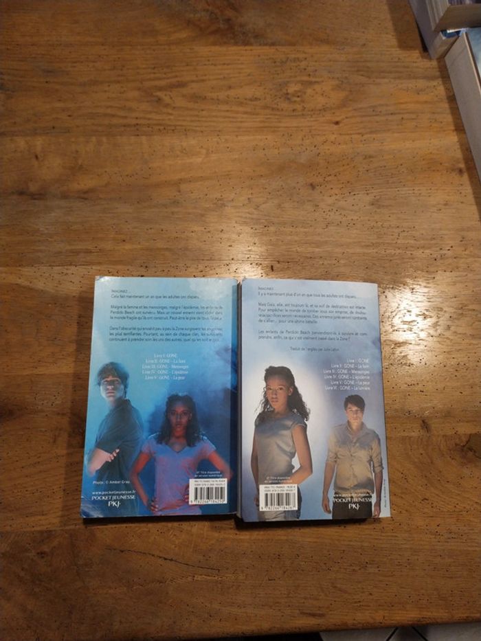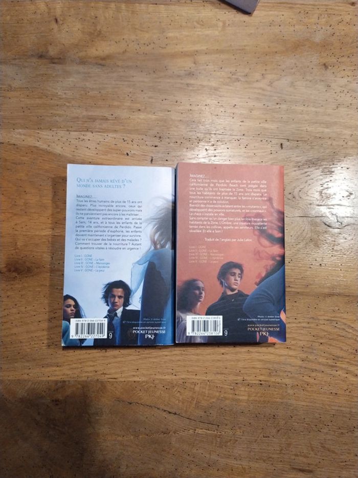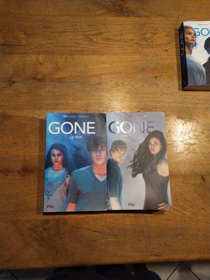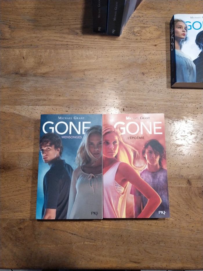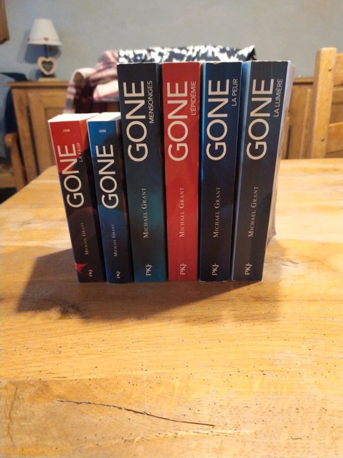 Serie complete des 6 livres Gone 1- Gone 2- La faim 3- Mensonges 4- L'épidémie 5- La peur 6- La lumiere Resumé du tome 1 : " En plein cours d'histoire, Sam et ses amis sont en train de prendre des notes quand tout à coup, le professeur disparaît. Affolés, ils sortent de classe et se rendent compte qu'il n'y a plus aucun être humain de plus de 15 ans : ils se sont tous volatilisés. Plus incroyable encore, certains de ceux qui restent développent des super-pouvoirs mais ils ne parviennent pas encore à les maîtriser…Cette aventure extraordinaire est arrivée à Sam, 14 ans, et à tous les enfants de la petite ville californienne de Perdido Beach. Passé la première période d'euphorie, les enfants et adolescents doivent maintenant s'organiser pour survivre. Qui va s'occuper des bébés et des malades ? Comment trouver de la nourriture ? Autant de questions vitales à résoudre d'urgence ! Sam devient malgré lui l'un des responsables de l'organisation mais il va devoir affronter d'autres chefs de bandes, aux idées beaucoup plus sombres…"