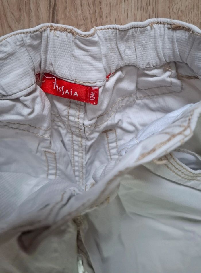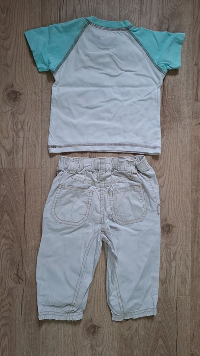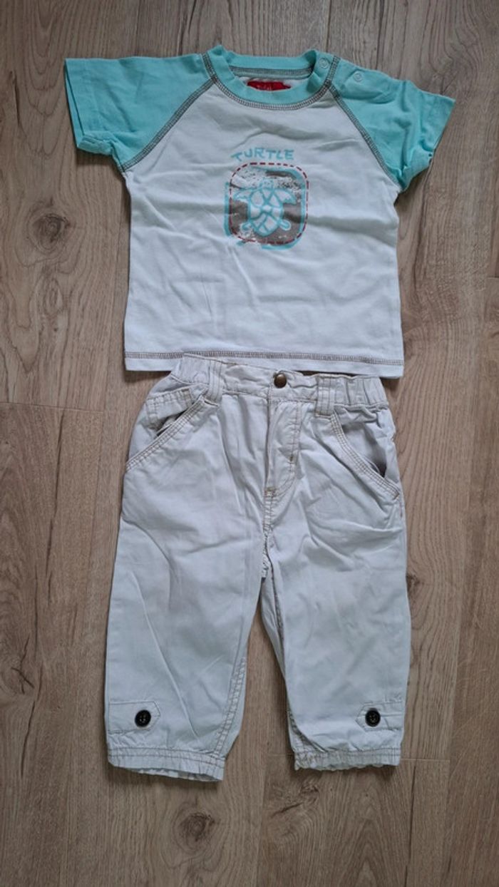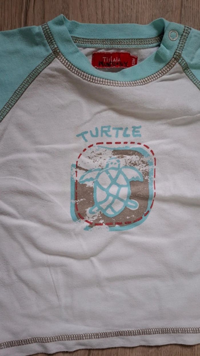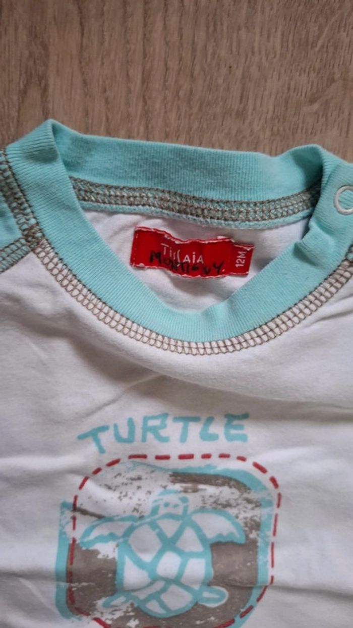 #loluxiagarcon12mois 2 pièces de marque Tissaia, 12mois : - 1 pantalon beige, crème, taille elastiquée. Matière souple. - 1 tee-shirt à manches courtes, blanc et bleu,pressions épaule gauche, étiquette marquée, très discrète auréole à droite du décor, thème tortue 🐢, cf photo.