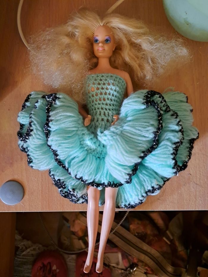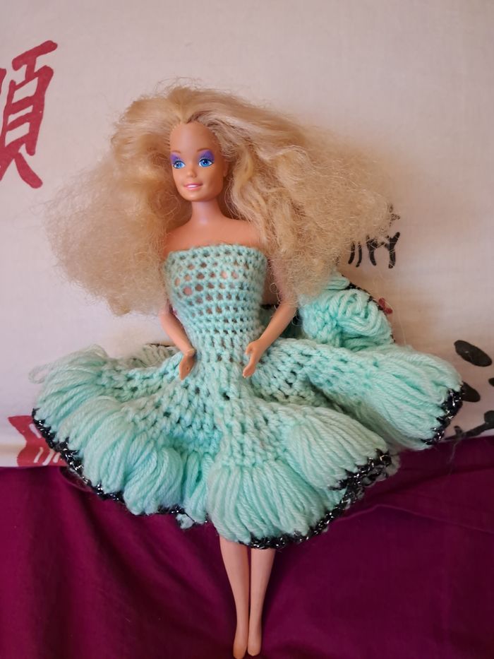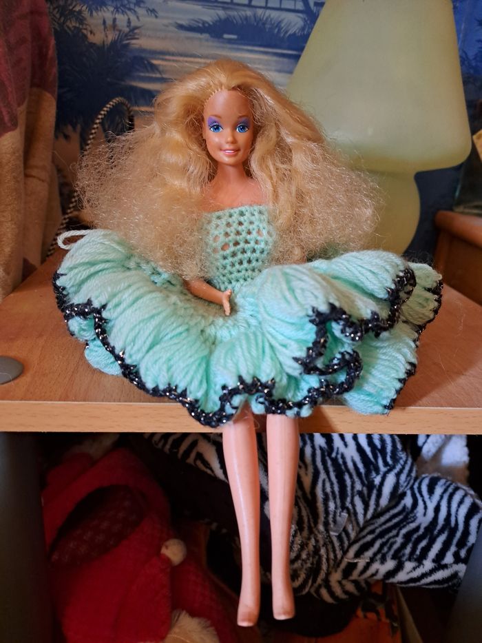 Voici ma poupée Barbie en excellent état ! Cette poupée classique a de longs cheveux blonds bouclés et de beaux yeux bleus. Elle porte une jolie robe verte. Elle est articulée au niveau des genoux. Cette poupée est très bien conservée et n'a aucun défaut visible. Elle est prête à offrir de nouvelles aventures à son futur propriétaire ! - Poupée Barbie classique - Cheveux blonds bouclés - Yeux bleus - Robe verte - Articulée au niveau des genoux - Excellent état de conservation