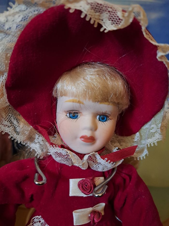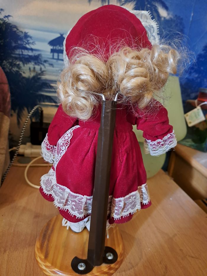 Poupée en porcelaine Dans sa jolie robe rouge Éléments en porcelaine : - tête - mains -pieds Vendue sur son support en bois État impeccable