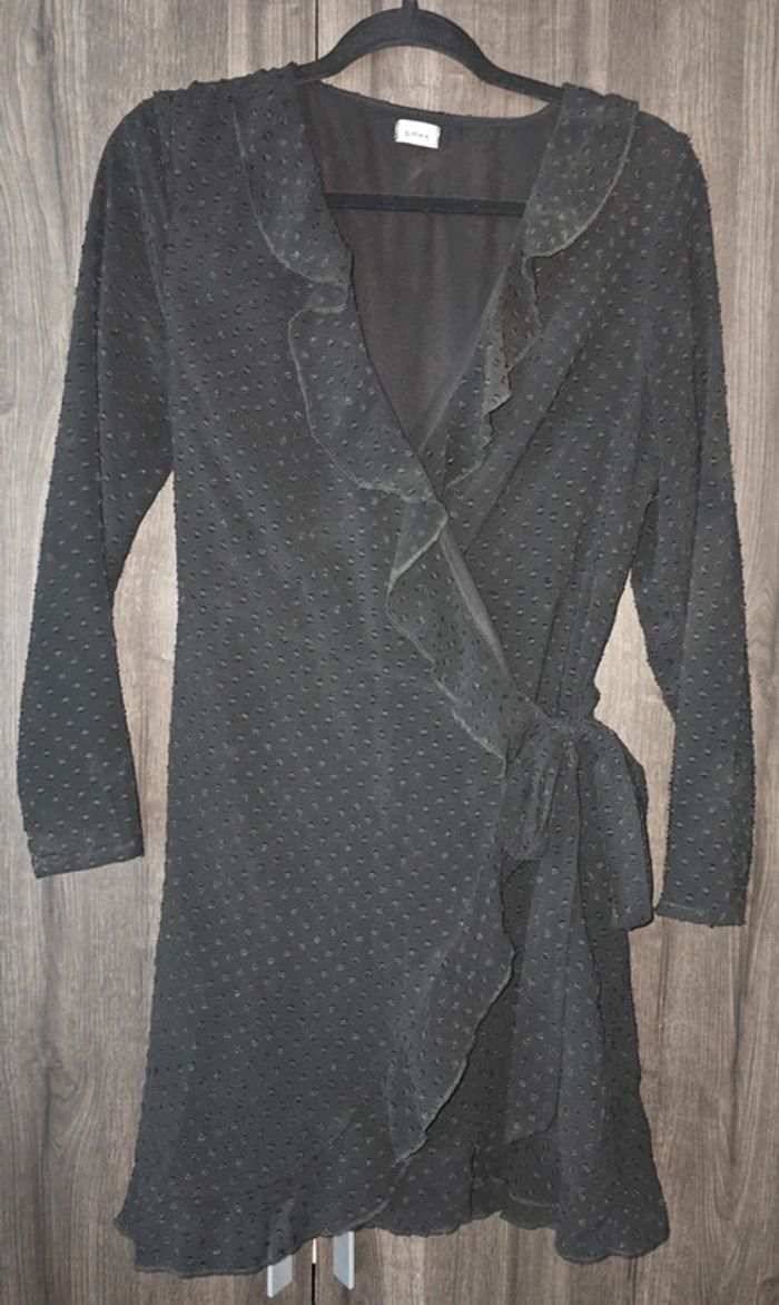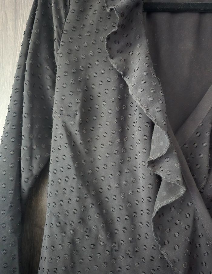Robe noire, cache coeur. La matière et les volants la rende féminine. Taille M. Très bon état
