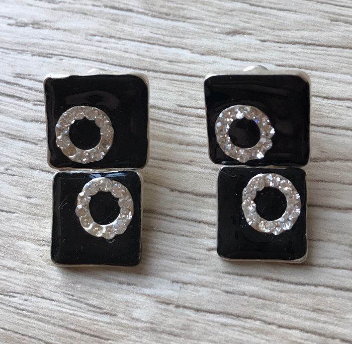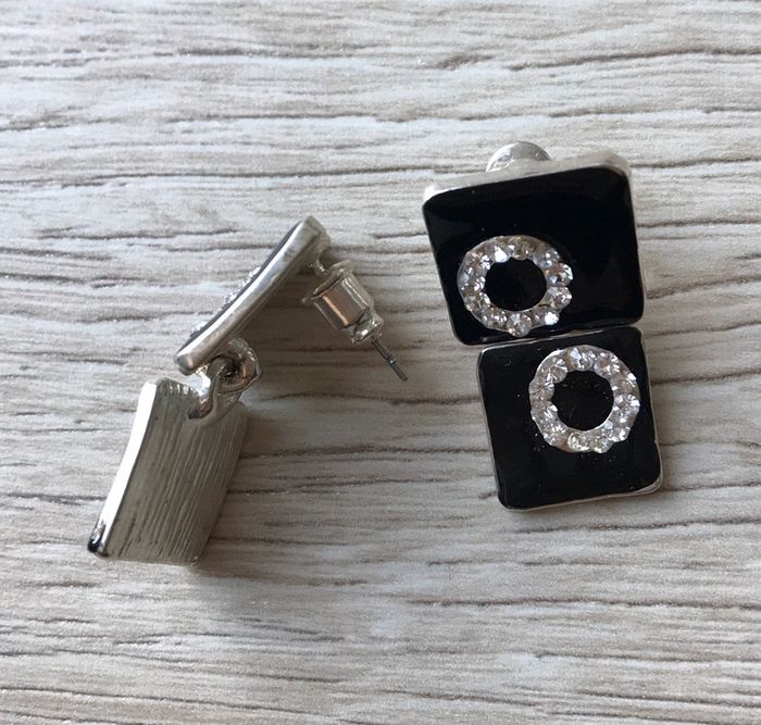 Boucles d’oreilles un peu pensantes et articulées donc elles bougent Manque quelques strass mais cela ne se voit que de très près