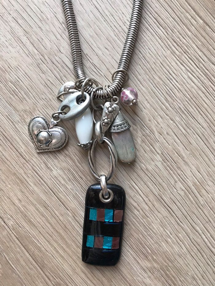 Collier argenté avec pendentifs argentés, 1 pendentif noir/bleu et rose, 1 perle de verre #collier #pendentifs