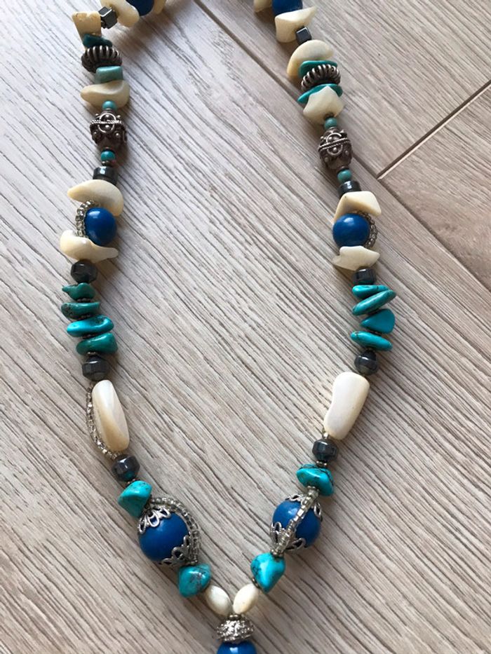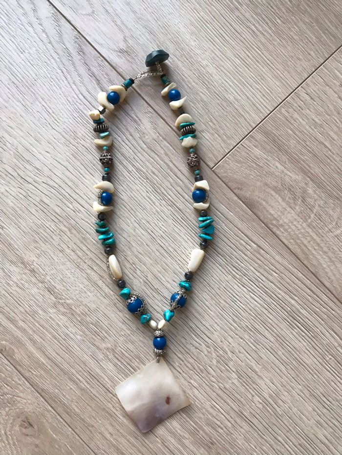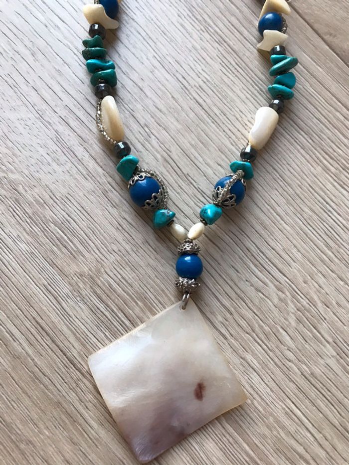 Collier avec perles bleues et blanches et pendentif en nacre #collier #nacre