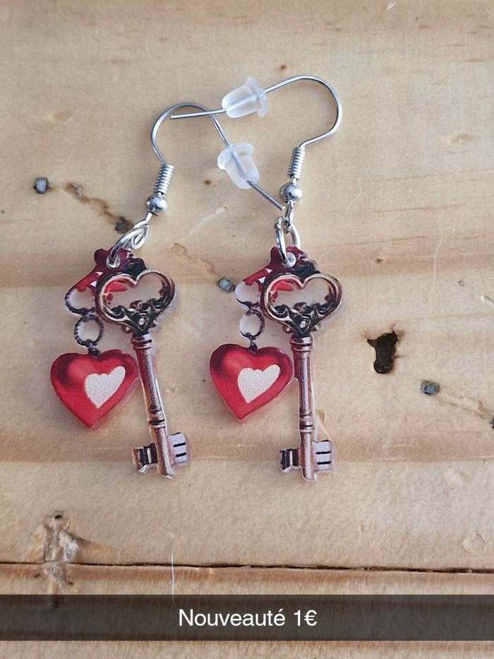 Bonjour, Je vends cette paire de boucle d'oreille avec clés et cœur rouge neuf jamais porte Créations fais main