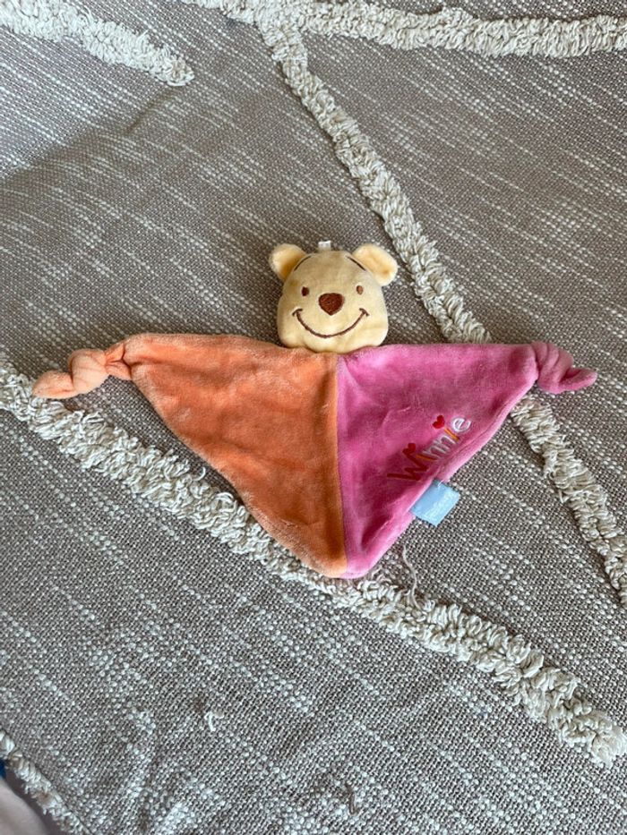 Peluche doudou plat 26cm Disney Winnie ours jaune rose et orange  très bon état - photo numéro 1