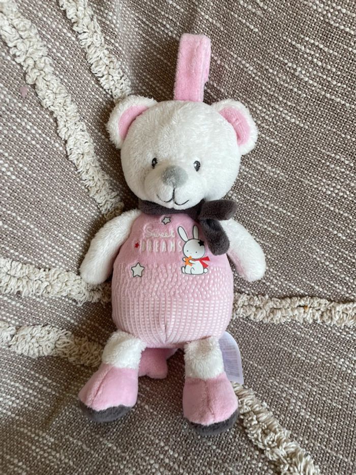 Peluche doudou musical 26cm Mots d’Enfants ours blanc avec doudou rose très bon état