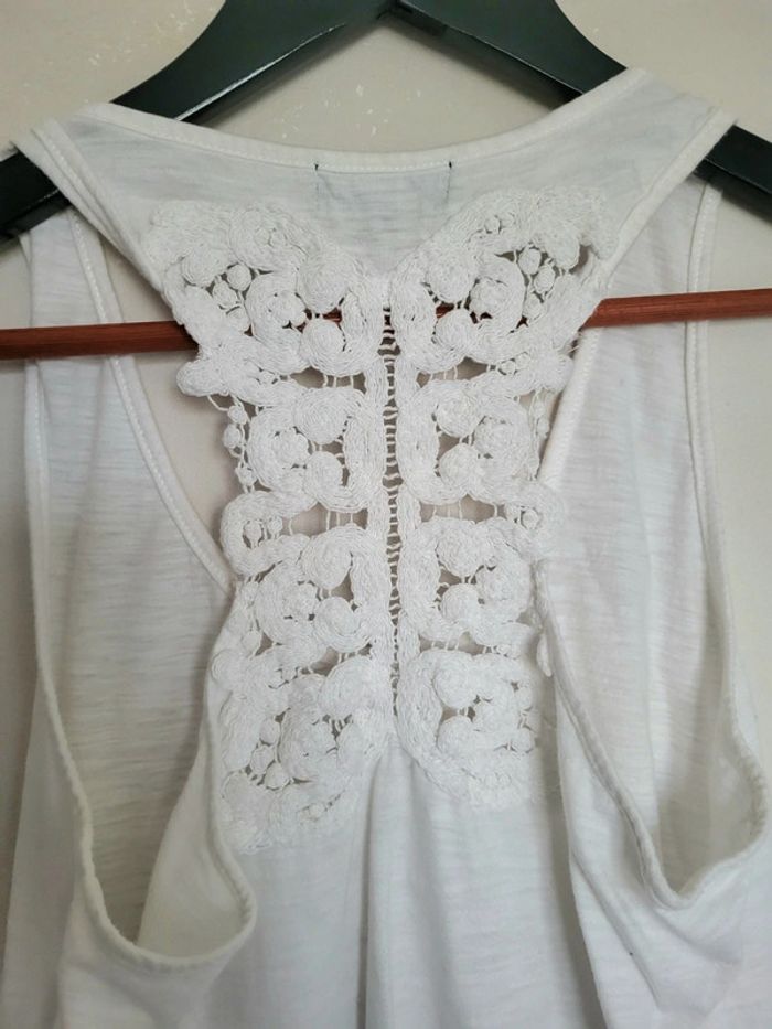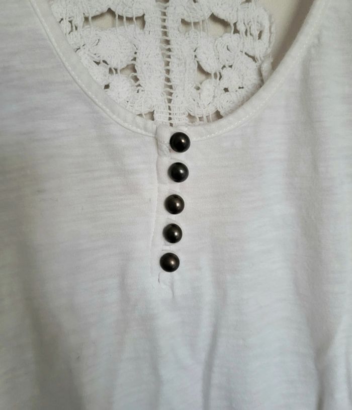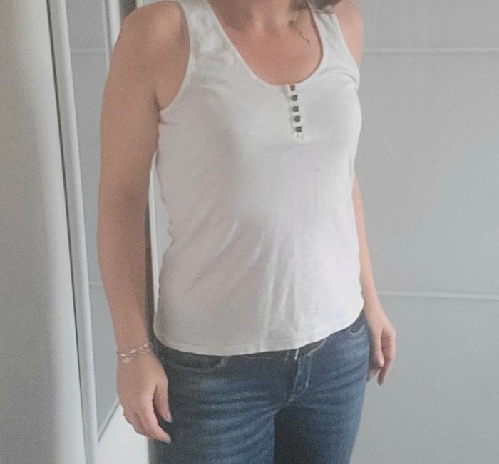 📌Lot 20% de remise dès 5 articles Débardeur blanc, bouton sur le haut et dos nageur avec de la dentelle ➡️Largeur à plat sous les bras 47 cm ▶️Etiquette composition manquante ⭐Excellent état ✈Envoi rapide des colis 💗 Abonnez vous à mon profil, nombreux articles ajoutés régulièrement ! #laetitresors_debardeur38 #laetitresors #debardeur #caroll #dentelle #dos #nageur #sans #manche #top #uni # bouton #été