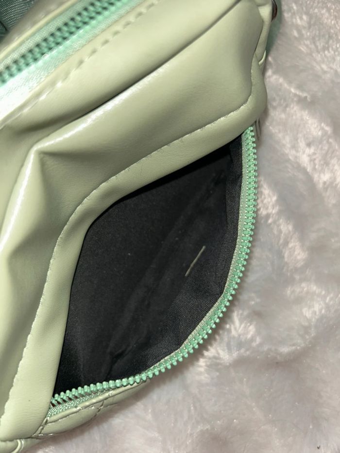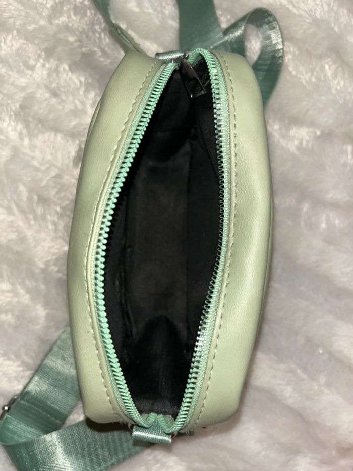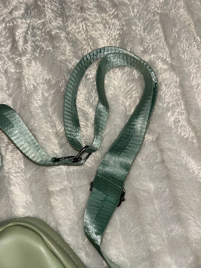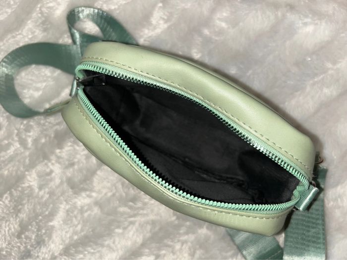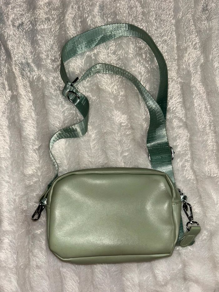 Sac à bandoulière vert en très bon état, sangle réglable et petite pochette devant