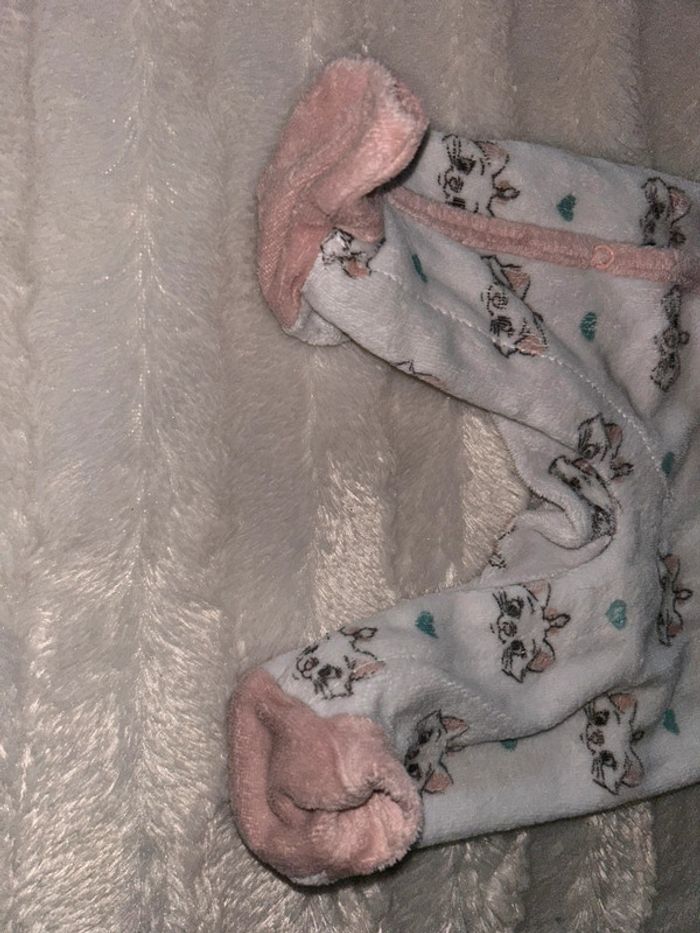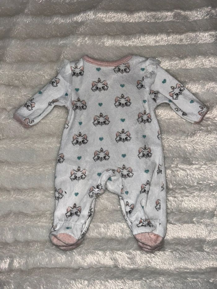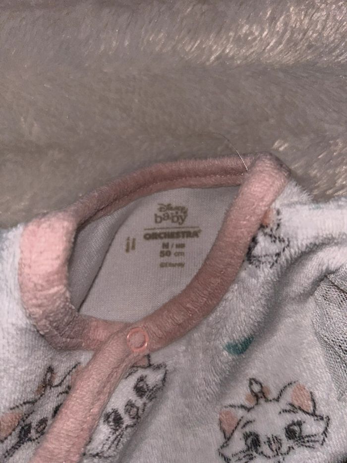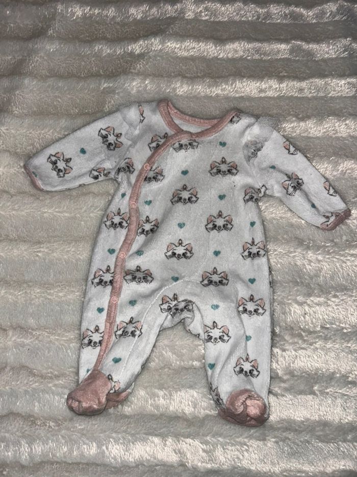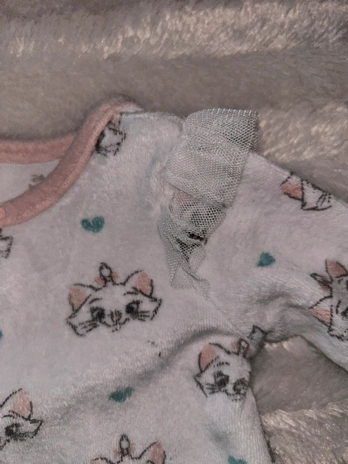 Pyjama en velours une pièce avec ouverture devant, motif Marie des Aristochats en très bon état Très peu porté de taille 50cm Volant sur les épaules