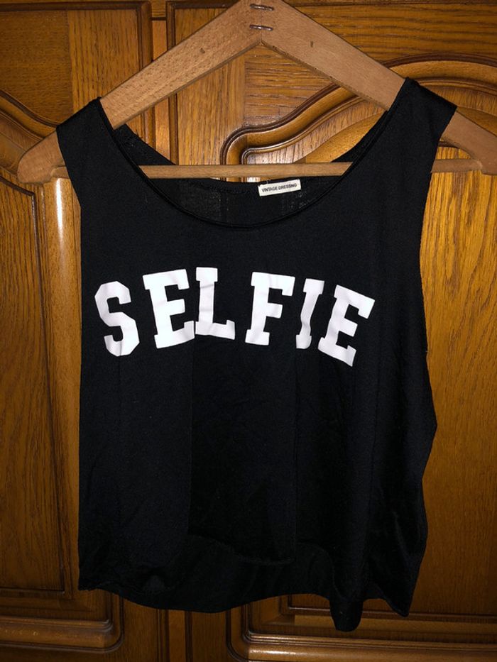 Top court noir avec écriture en très bon état de taille S N’hésitez pas pour plus d’informations et à faire des lots 🌸 #audreybtaille36