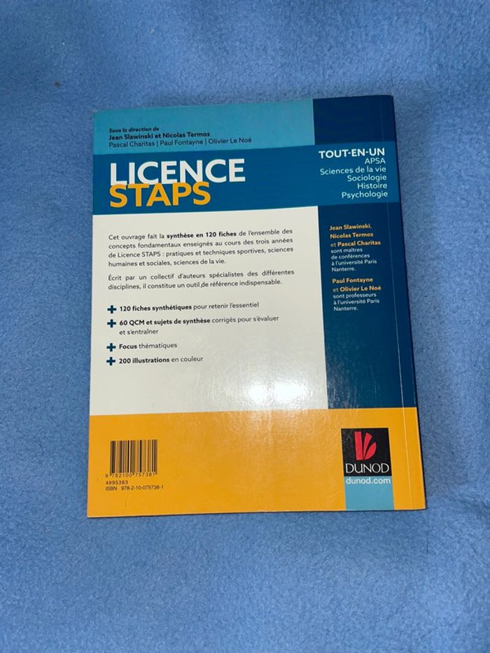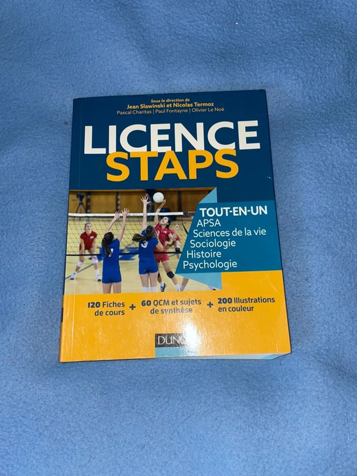 Livre Licence STAPS Tout en Un, il y a 120 fiches de cours, 60 QCM et 200 illustrations Le livre est en très bon état