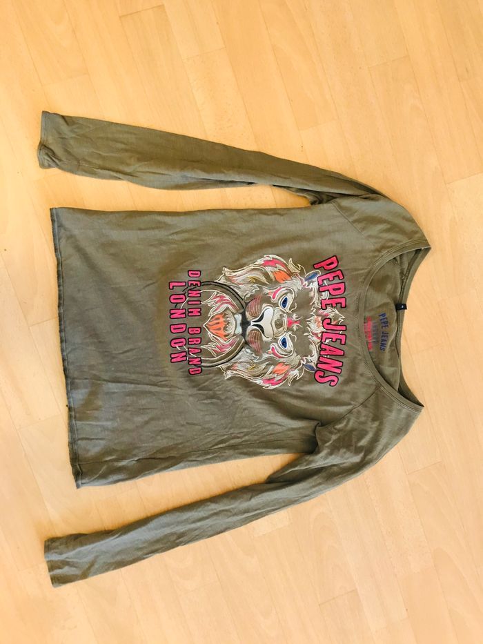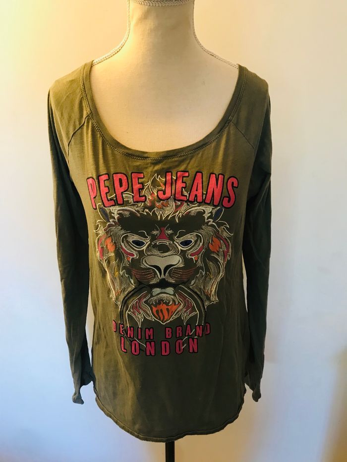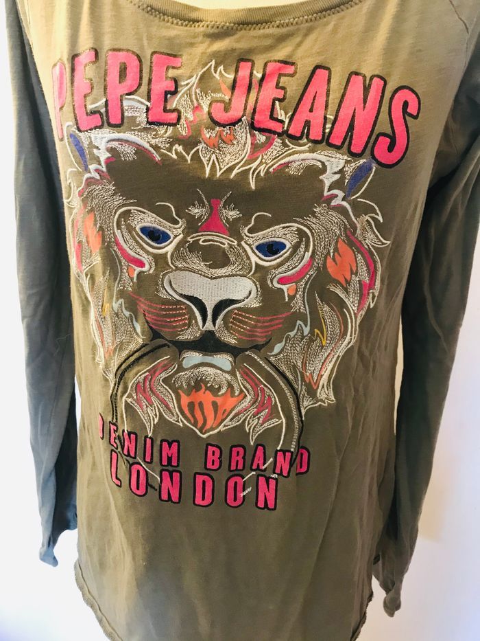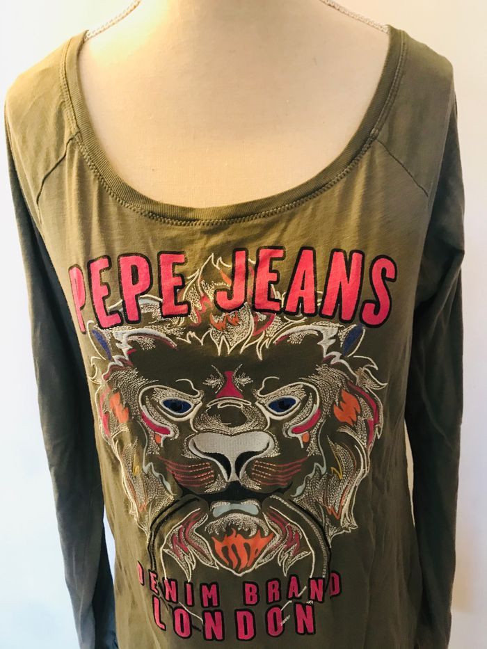 tee shirt taille S PEPE JEANS couleur vert kaki imprimé tigre rose,blanc,bleu et argenté col rond manches longues longueur totale = 60 cm largeur aisselles a aisselles = 45 cm très bon état