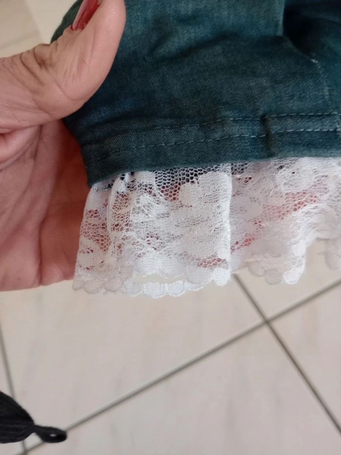 Dentelle dans le bas, présence de deux petites poches Croisé dans le dos Plus d'étiquette matière ( je pense à du coton) ni taille Aspect jean mais ce n'est pas du jean Bretelles à bretelles 27 cm longueur 77 cm aisselle 45 cm #carineleray_femme_36