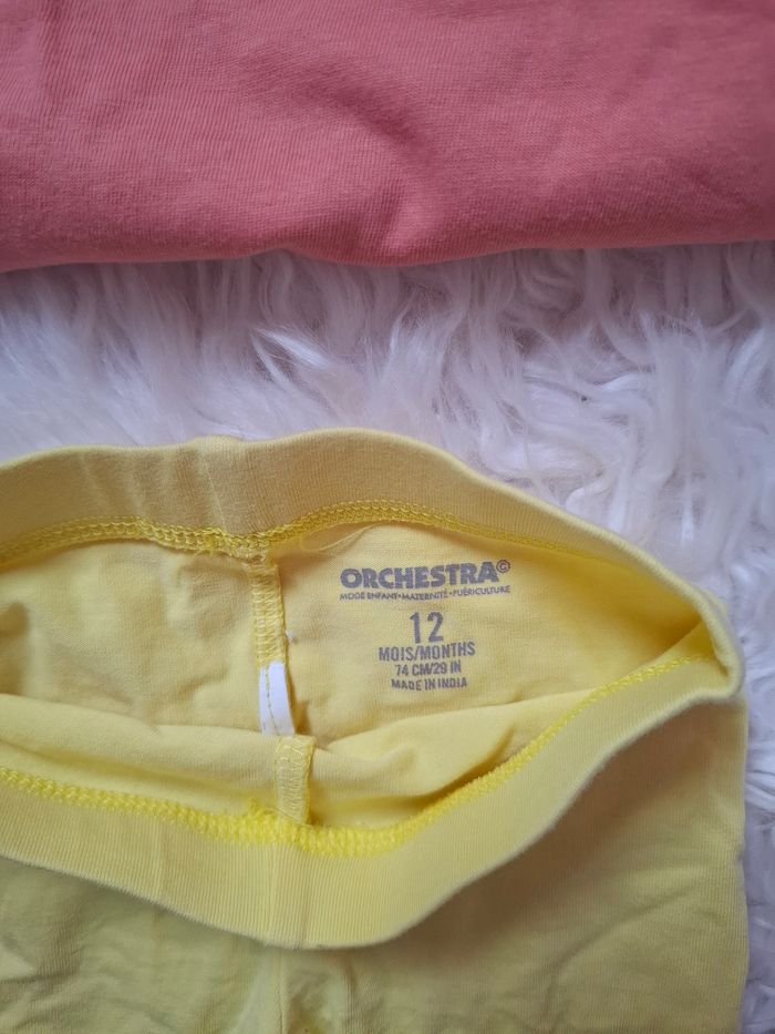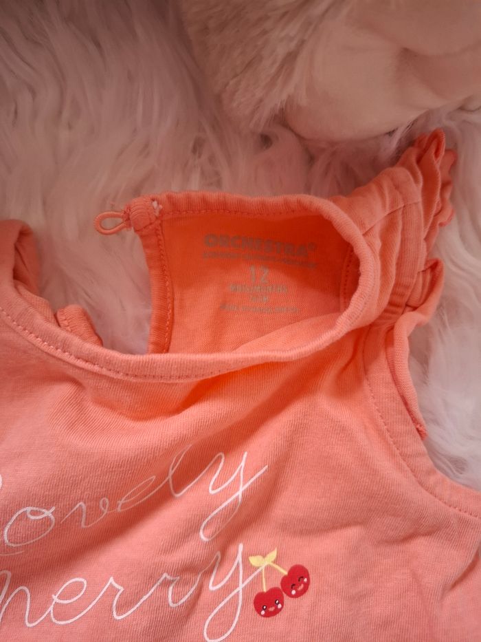 Un ensemble pour bébé avec ses petits motifs Couleur corail et jaune Taille 12 mois Marque orchestra Très bon état