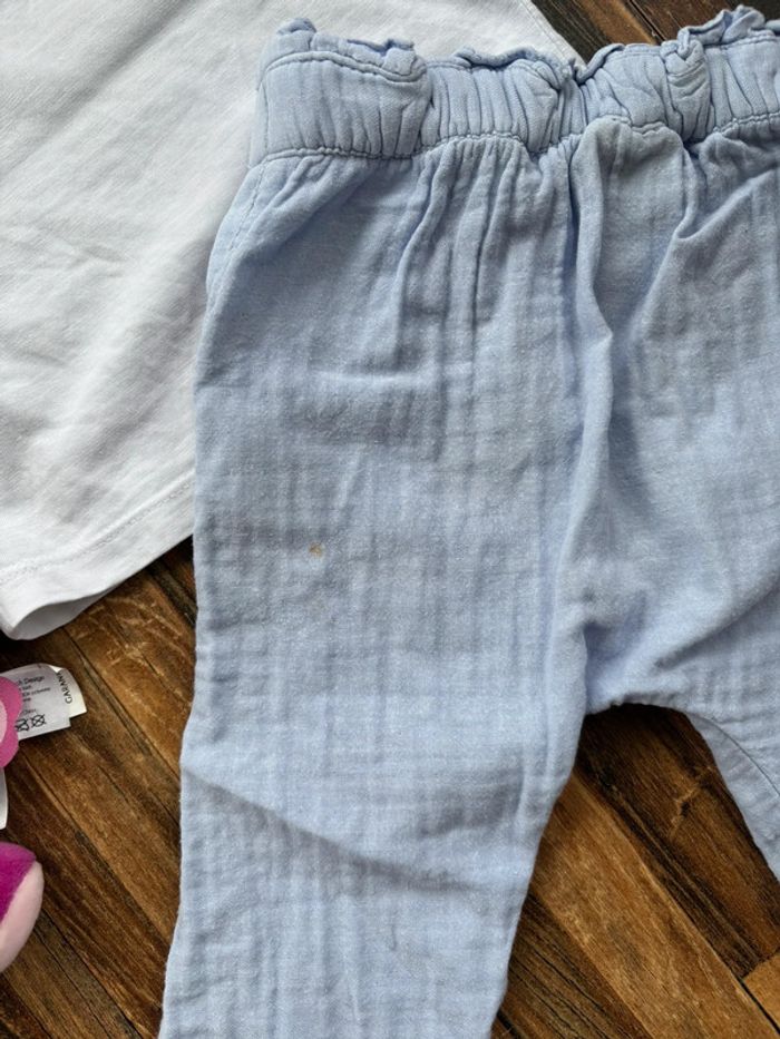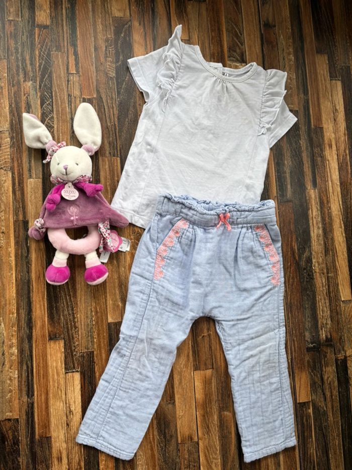 Ensemble t-shirt + pantalon léger fille Taille 12 mois Multimarques Petite tâche sur l'arrière du pantalon, voire photo #allexy_ensemble_12mois_fille #allexy_vêtements_12mois_fille