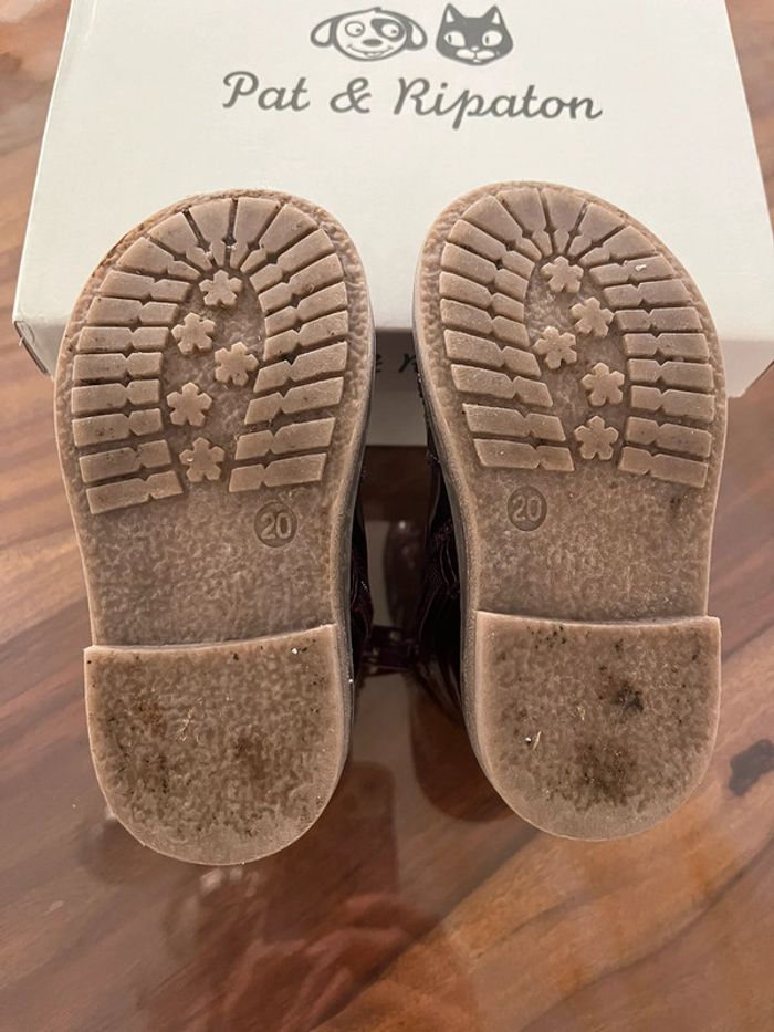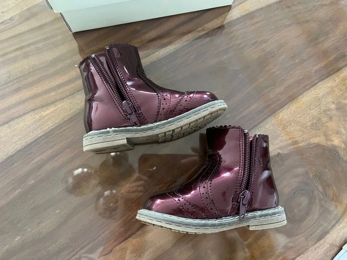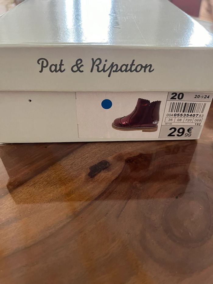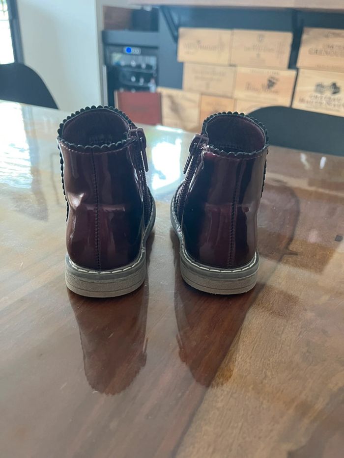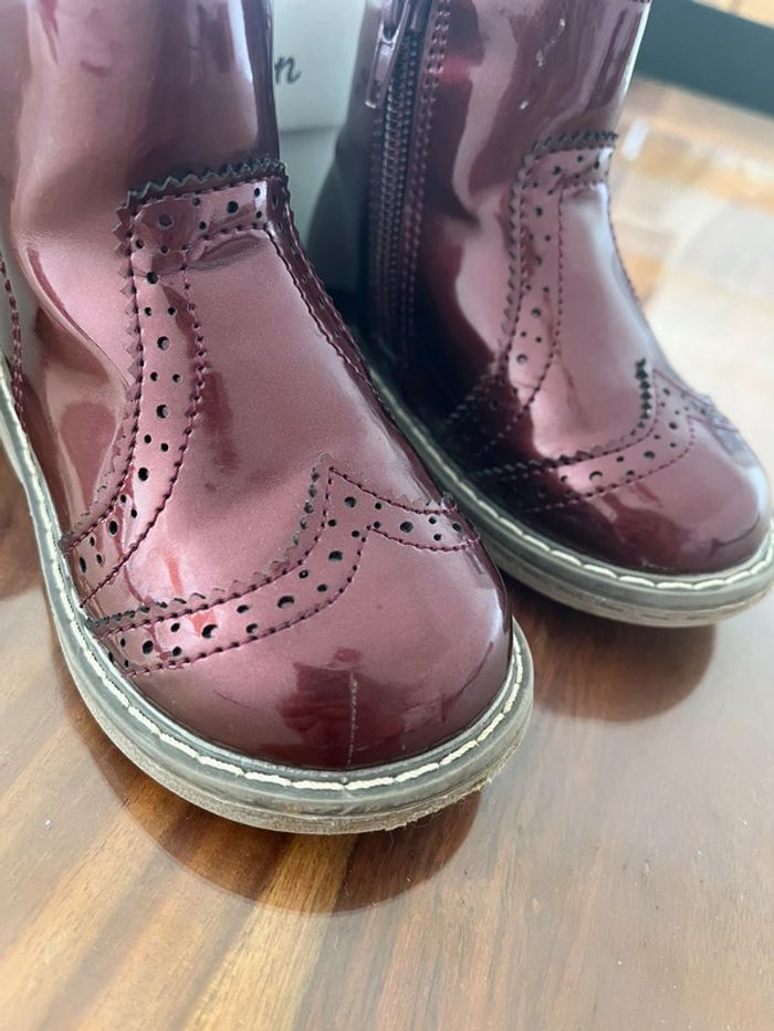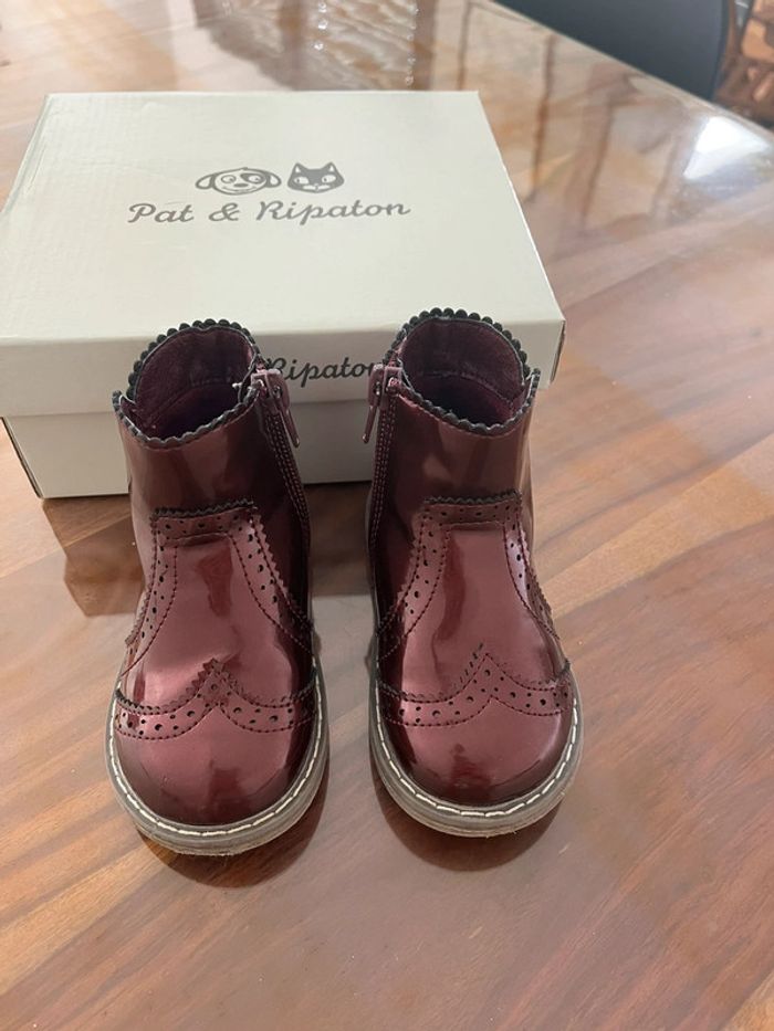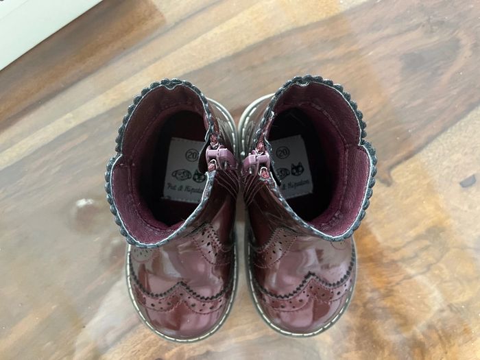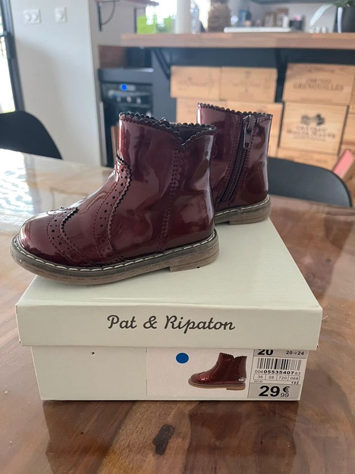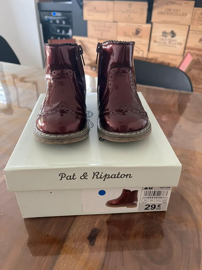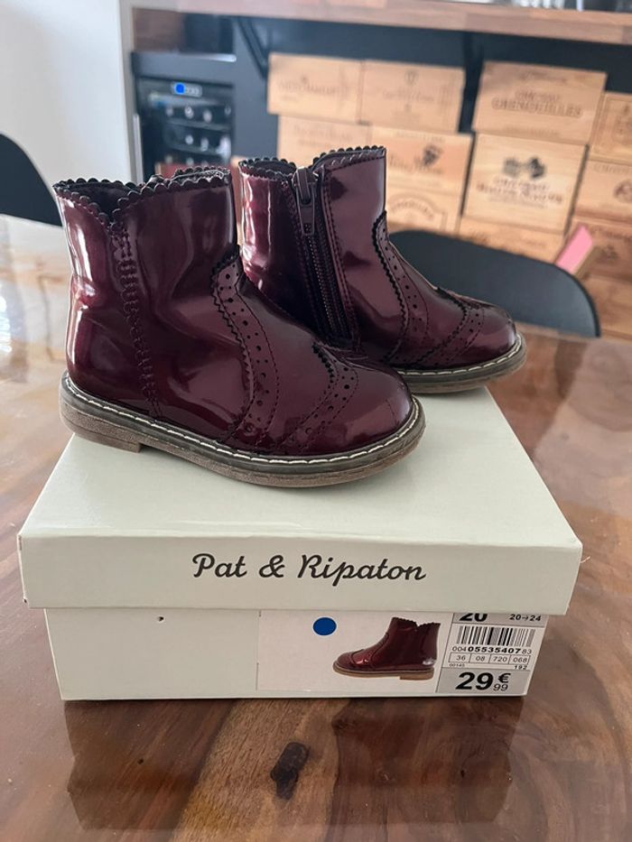 Bottine bordeaux vernis Pat et Ripaton bébé fille Fermetures éclairs fonctionnelles Taille 20 En très bon état (petite entaille sur l’avant du pied droit cf 9 mais ne se voit quasiment pas)