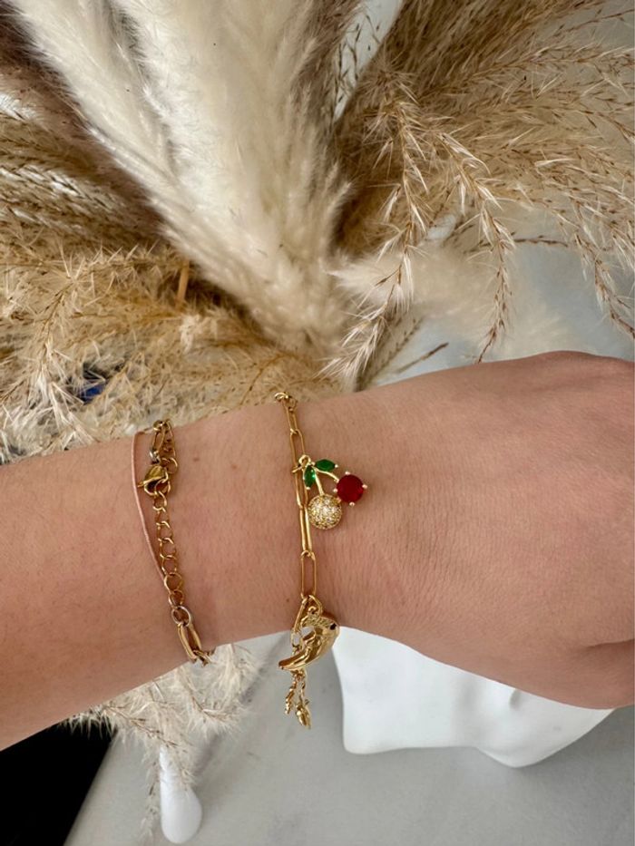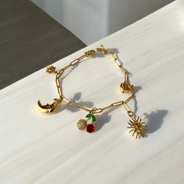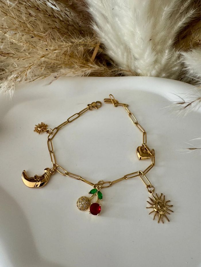 Magnifique bracelet breloque cerise lune cœur soleil acier inoxydable résisant à l’eau Doré or rouge En parfait état #clairevidesondressingbijoux #stainlesssteel #stainlesssteeljewelry