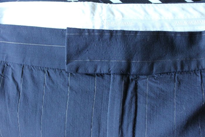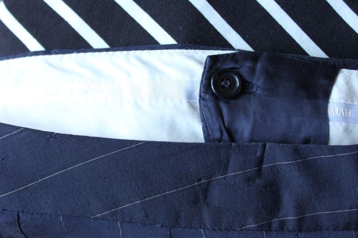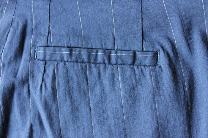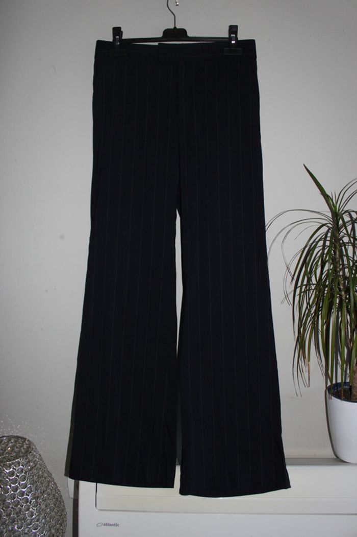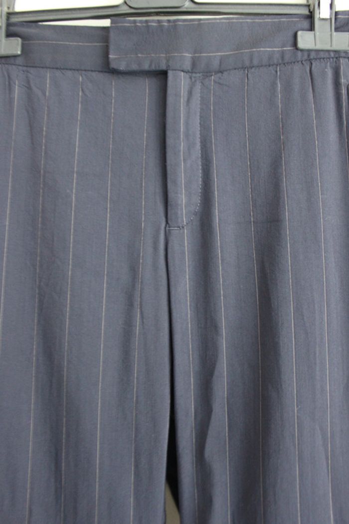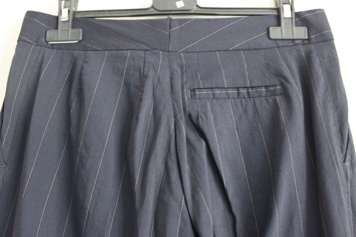 Pantalon type tailleur, léger et élégant. Fines rayures blanches, bouton caché. Très beau tombé, fait de belles fesses.