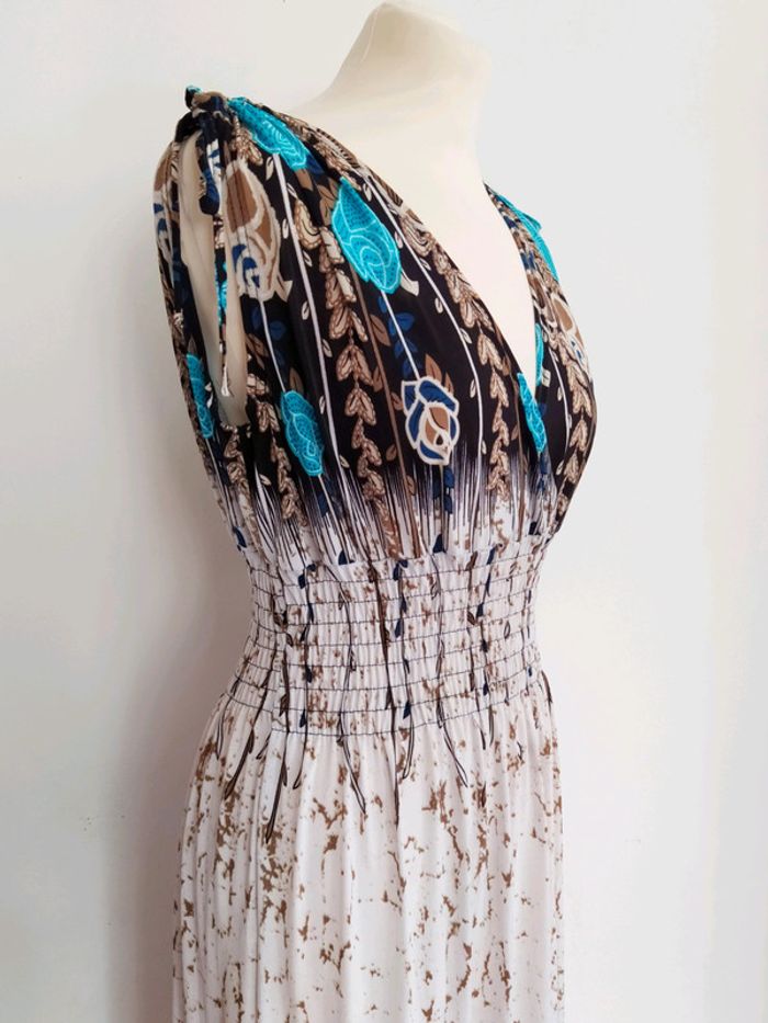 Les épaules peuvent être desserrées. S'adapte aux petites comme aux fortes poitrines. C'est très agréable de porter ce tissu fluide et frais. Convient à toutes les morphologies car elle allonge le corps. Pas de problème pour une enceinte.