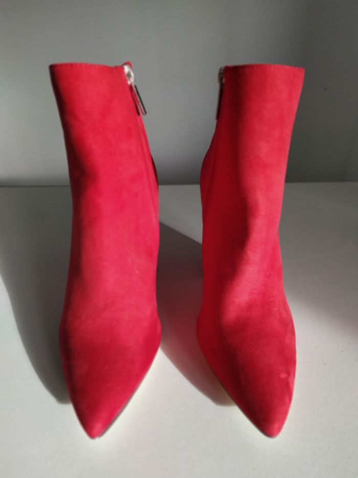 Bottines en peau de pêche à talons carrés. Achetées 63€. Jamais portées, trop petites pour moi. Comme vous pouvez le voir sur les photos, les semelles et talons sont intactes.