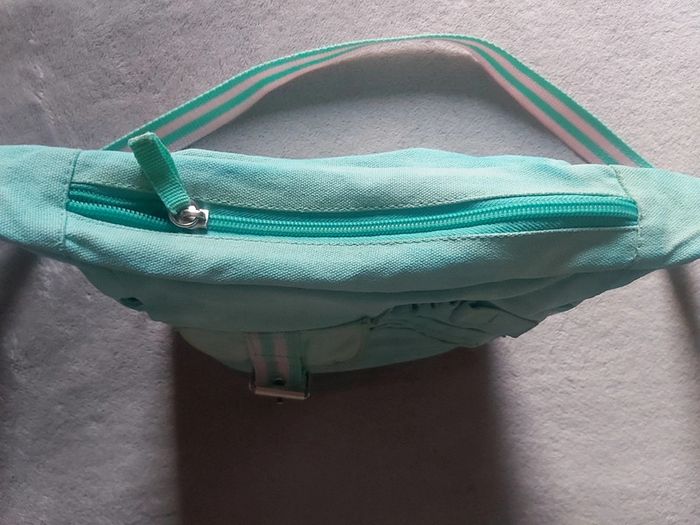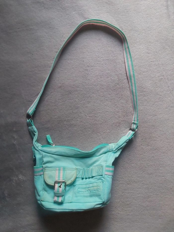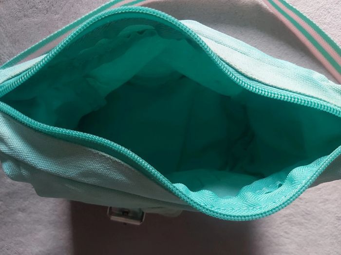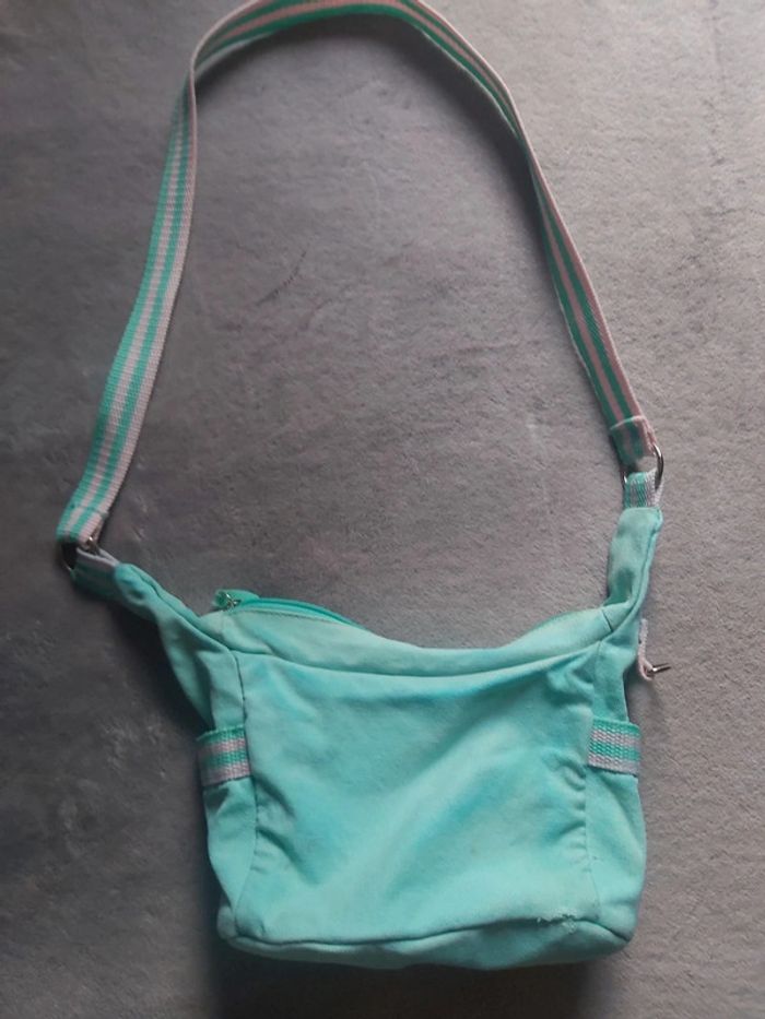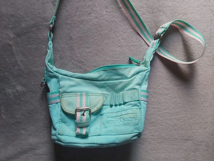 Bonjour, je vends une sacoche en bandoulière. Coloris vert d'eau et rose. Longueur 22 cm. 1 pochette devant et 1 sur chaque côté à scratch. Prix 3 €.