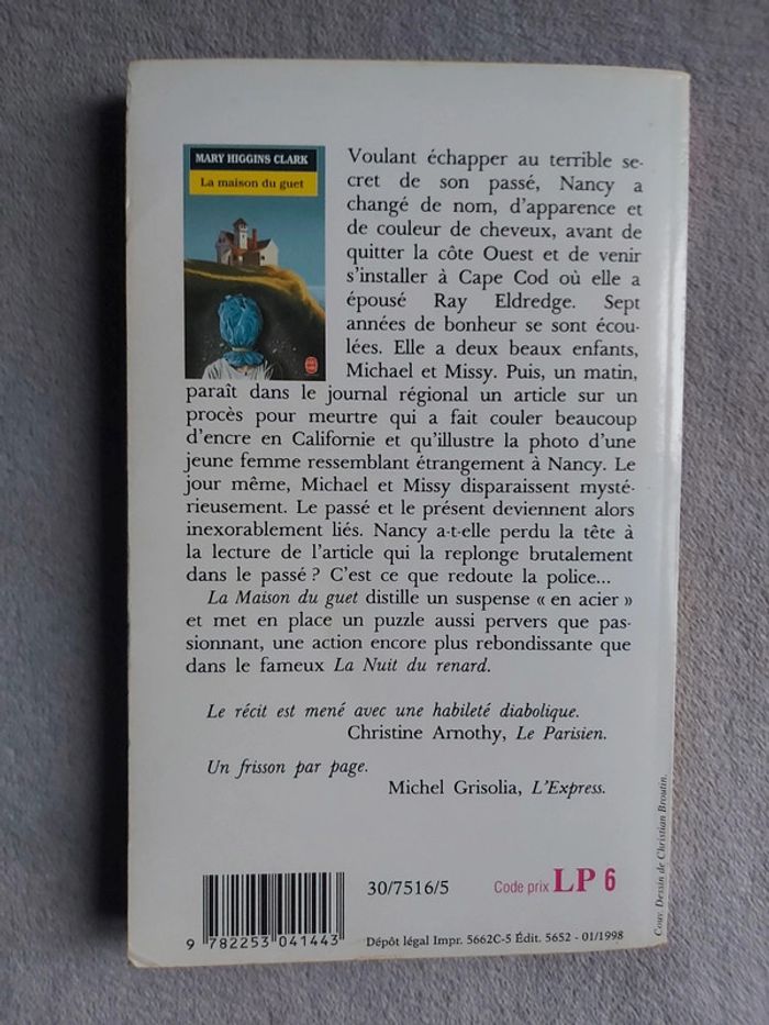 Bonjour, je vends un livre de poche de Mary Higgins Clark. Titre "La maison du guet". Description : Afin de fuir son passé, Nancy a changé de nom et d’apparence, avant de quitter la côte Ouest et de venir s’installer à Cape Cod où elle a épousé Ray Eldredge.Sept années de bonheur se sont écoulées. Ils ont deux beaux enfants, Michael et Missy. Puis un matin, dans le journal régional, paraît un article sur un procès pour meurtre qui a fait couler beaucoup d’encre en Californie et qu’illustre la photo d’une jeune femme ressemblant étrangement à Nancy. Le jour même, Michael et Missy disparaissent…La Maison du guet distille un suspense «en acier». L’action est encore plus haletante que dans la fameuseNuit du renard. About the Author D’abord secrétaire puis hôtesse de l’air, ce n’est qu’au décès de son mari que Mary Higgins Clark se lance dans la rédaction de scripts pour la radio. Son premier ouvrage est une biographie de George Washington. Elle décide ensuite d’écrire un roman à suspense, La Maison du guet, son premier best-seller. Encouragée par ce succès, elle continue à écrire tout en s’occupant de ses enfants. En 1980, elle reçoit le Grand prix de littérature policière pour La Nuit du renard. Mary Higgins Clark écrit alors un roman par an, toujours accueilli avec le même succès par le public. Elle est traduite dans le monde entier et plusieurs de ses romans ont été adaptés pour la télévision. Elle est décédée en janvier 2020. Prix 3 €.