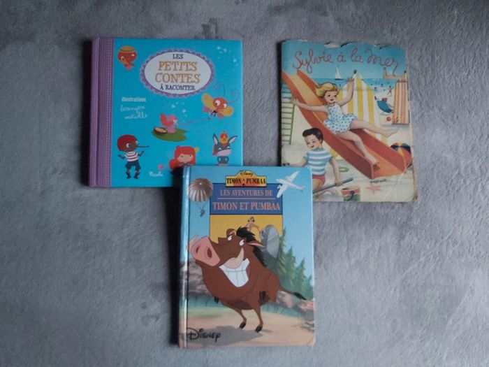 Bonjour, je vends un lot de livres pour enfants à partir de 3 ans : "Les petits contes à raconter" (4 €), "Sylvie à la mer" (2 €), "Les aventures de Timon et Pumbaa" (3 €). Prix 9 € le lot.