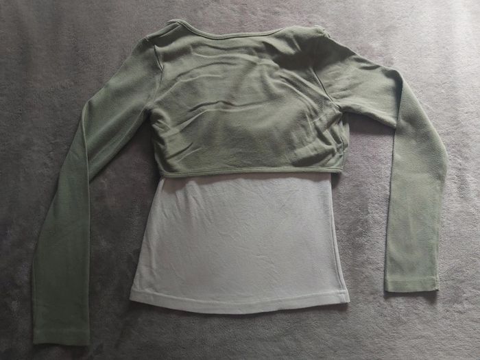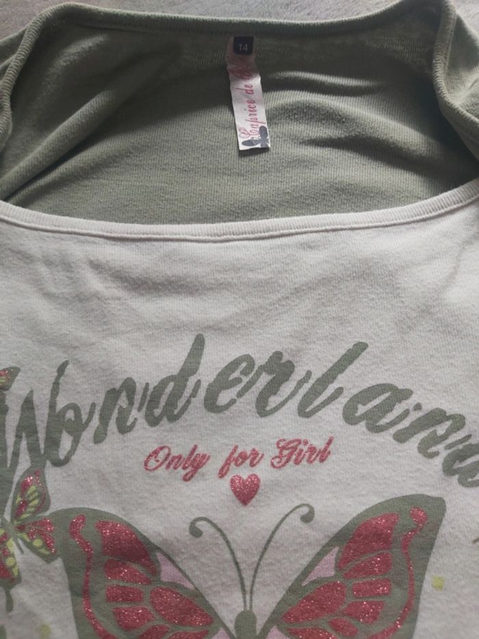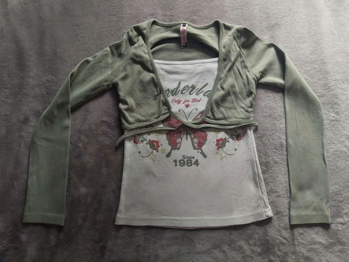Bonjour, je vends un T-Shirt blanc avec motif papillon pour fille. Gilet manches longues attaché au T-Shirt. 100 % Coton. Taille 14 ans. Marque Caprice de Fille. Prix 3 €.