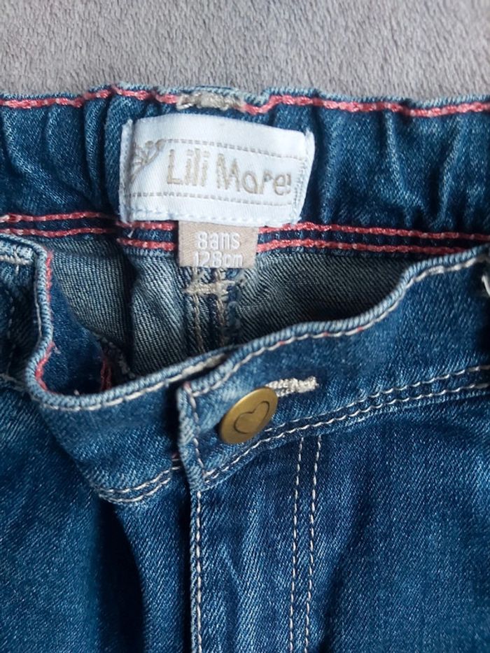 Bonjour, je vends un Jeans bleu pour fille Taille 8 ans et un débardeur noir Taille 7/8 ans. Jeans 2 poches avant et 2 poches arrière 98 % Coton 2 % Élasthanne. Marque Lili Marelle. Prix 5 € le lot.