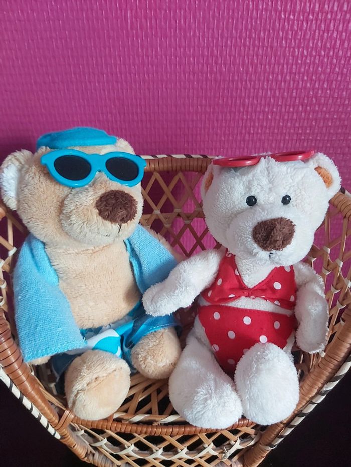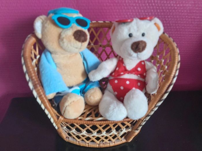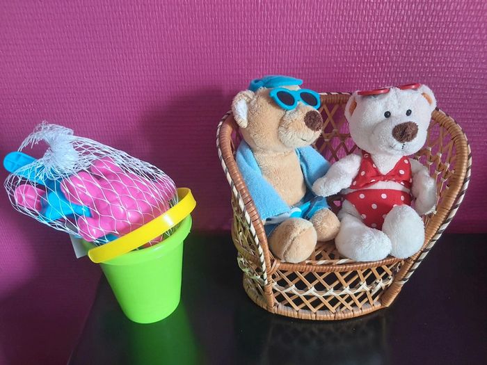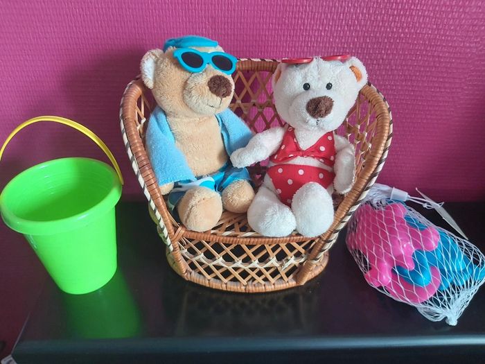 Bonjour, je vends un lot décoratif sur le thème de la plage. Composé d'un fauteuil en osier accompagné d'un couple de peluches "ours à la plage". Je joins un mini seau et des accessoires de plage. Idéal pour faire une décoration d'une vitrine d'un magasin. Prix 15 € le lot.