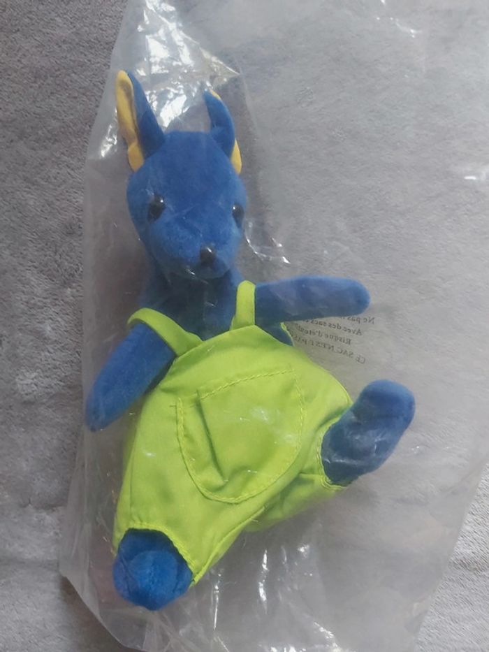 Bonjour, je vends une peluche kangourou bleu en salopette verte. Longueur 20 cm. Produit neuf. Prix 5 €.