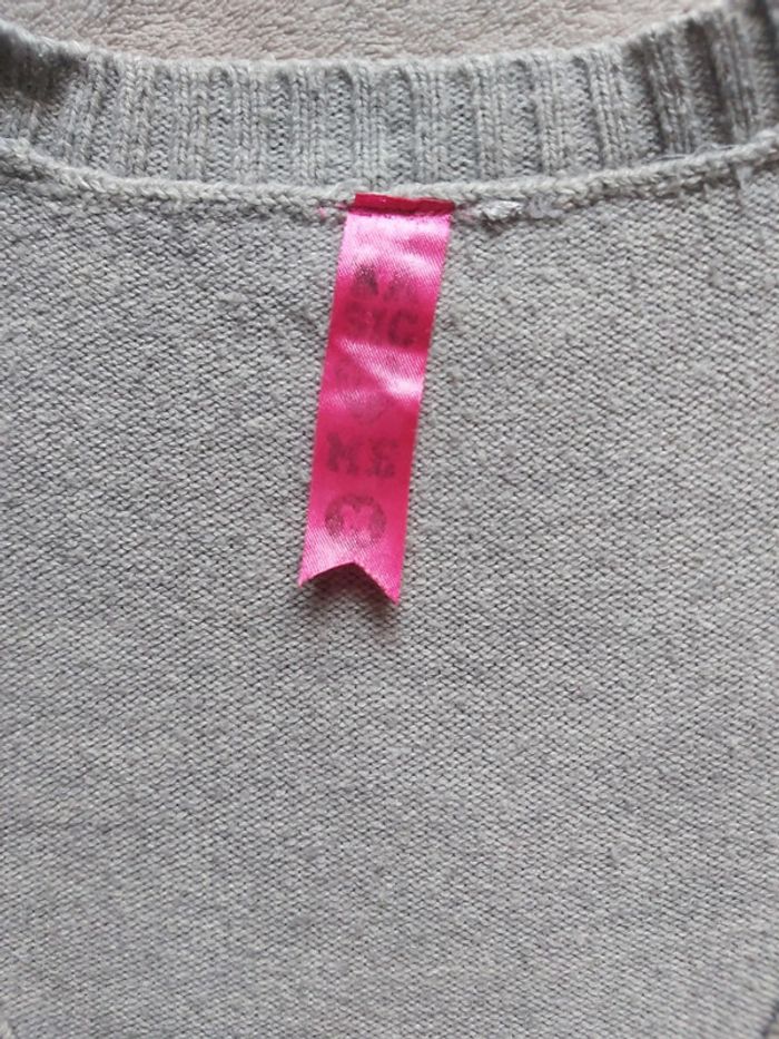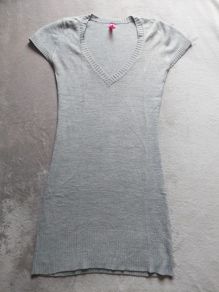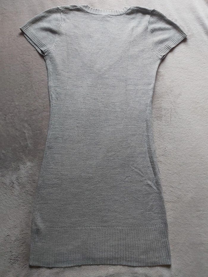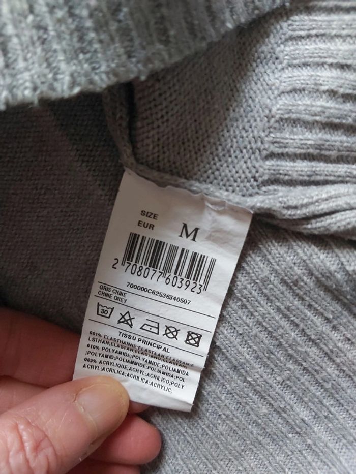 Bonjour, je vends une robe pull gris chiné pour femme. Manches courtes. Col V. 89 % Acrylique 10 % Polyamide 1 % Élasthanne. Taille M (38). Longueur des épaules, en bas 93 cm. Peut être portée avec une ceinture à la taille. Prix 6 €.