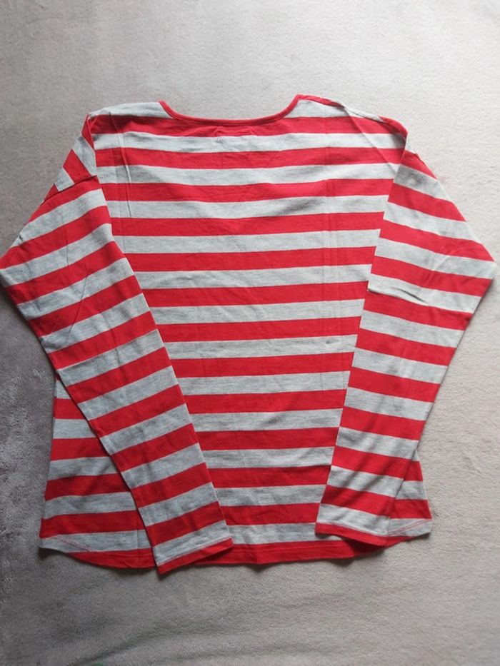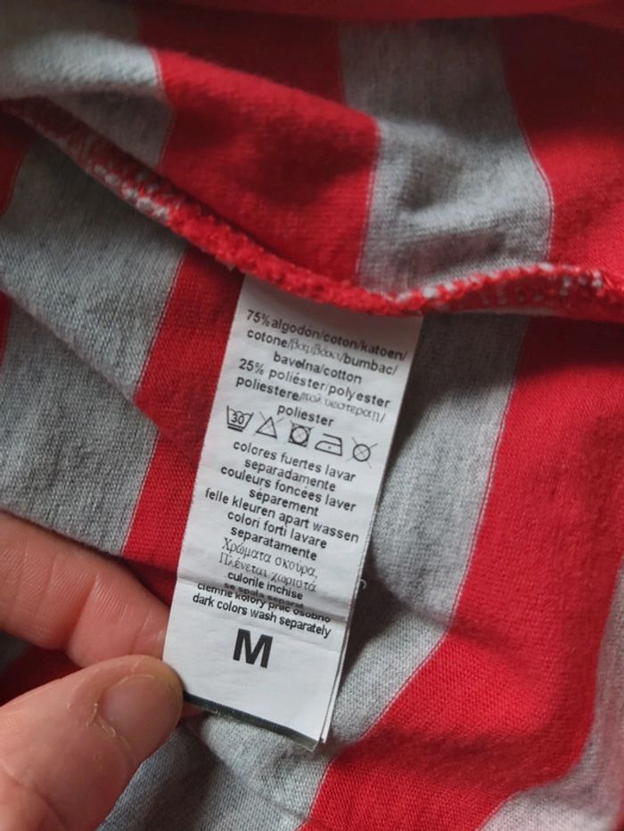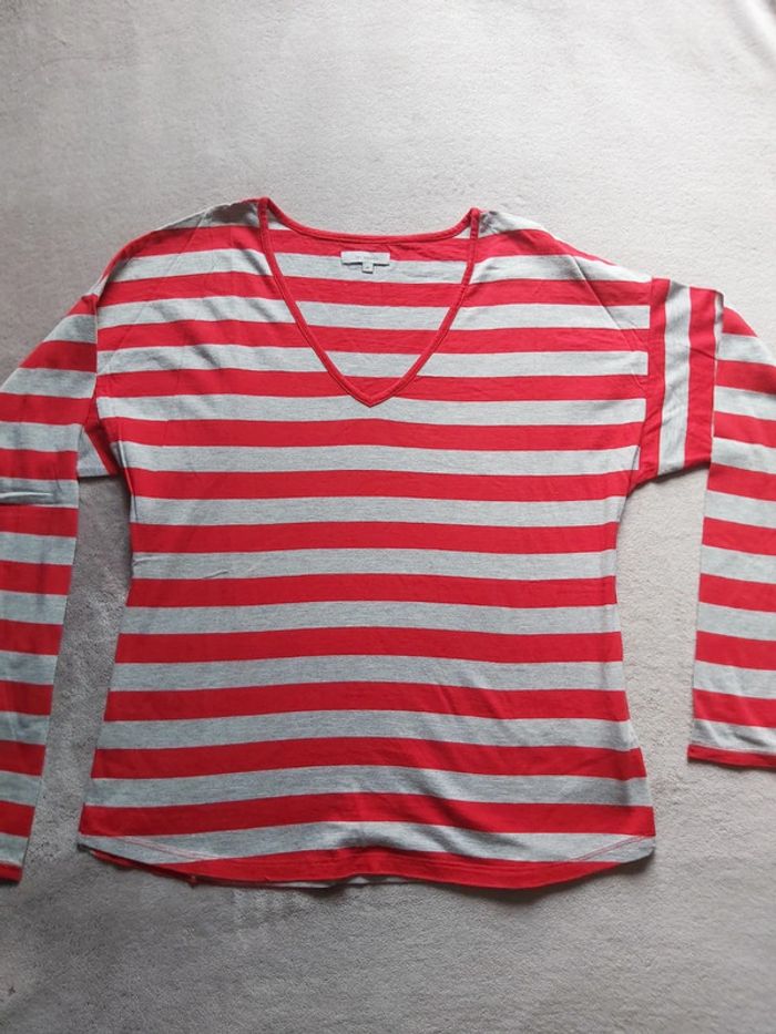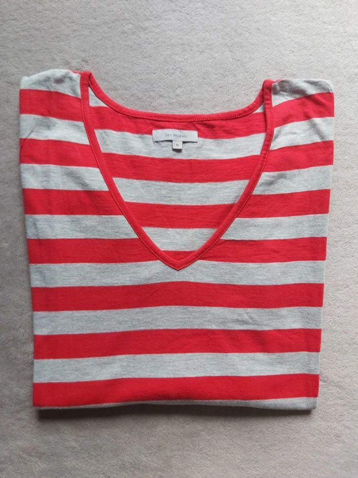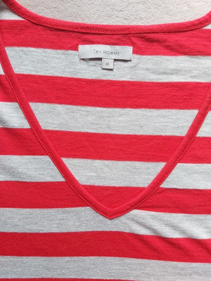 Bonjour, je vends un T-Shirt rayé rouge et gris pour femme. Manches longues. 75 % Coton 25 % Polyester. Taille M (38). Longueur sous les aisselles 53 cm. Marque Tex Woman. Prix 4 €.